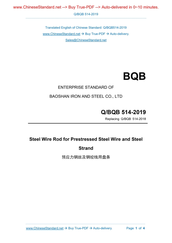 Q/BQB 514-2019: Steel wire rod for prestressed steel wire and steel strand Delivery: 9 seconds. True-PDF full-copy in English & invoice will be downloaded + auto-delivered via email. See step-by-step procedure Q/BQB 514: Historical versions