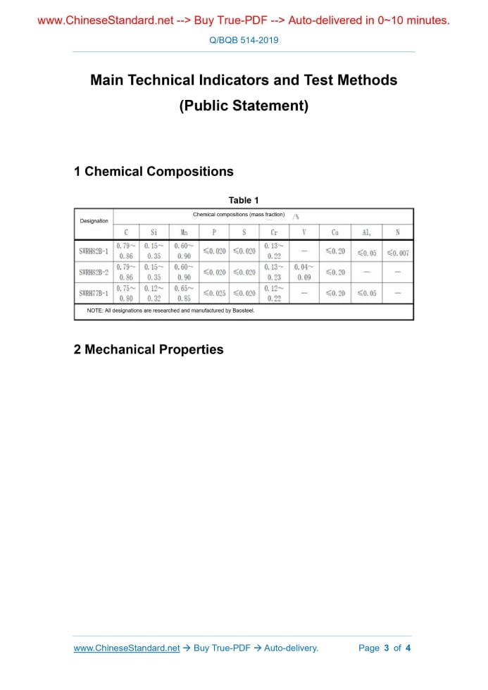 Similar standardsQ/BQB 514-2019: Steel wire rod for prestressed steel wire and steel strand---This is an excerpt. Full copy of true-PDF in English version (including equations, symbols, images, flow-chart, tables, and figures etc.), auto-downloaded/delivered in 9 seconds, can be purchased online: https://www.ChineseStandard.net/PDF.aspx/QBQB514-2019ENTERPRISE STANDARD OF BAOSHAN IRON AND STEEL CO., LTD Replacing Q/BQB 514-2018 Steel Wire Rod for Prestressed Steel Wire and Steel Strand Table of Contents1 Chemical Compositions... 3 2 Mechanical Properties... 3 3 Inspection and Test... 4 Main Technical Indicators and Test Methods (Public Statement)1 Chemical CompositionsTable 12 Mechanical PropertiesDesignation Chemical compositions (mass fraction) NOTE. All designations are researched and manufactured by Baosteel. ......Source: Above contents are excerpted from the full-copy PDF -- translated/reviewed by: www.ChineseStandard.net / Wayne Zheng et al. |