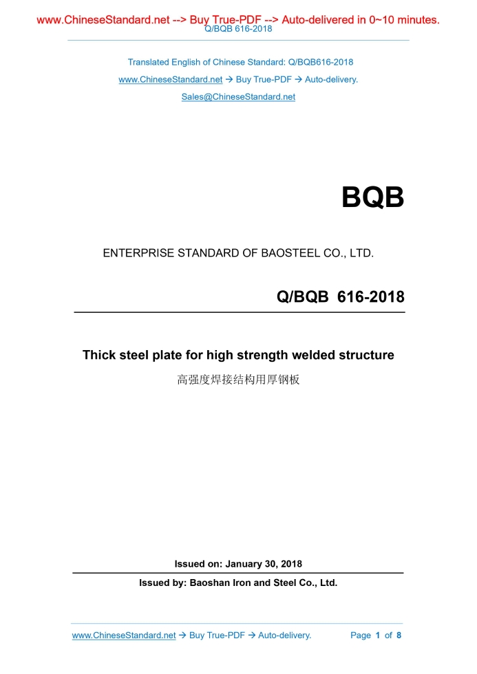 Q/BQB 616-2018: Thick steel plate for high strength welded structure Delivery: 9 seconds. True-PDF full-copy in English & invoice will be downloaded + auto-delivered via email. See step-by-step procedure Q/BQB 616: Historical versions