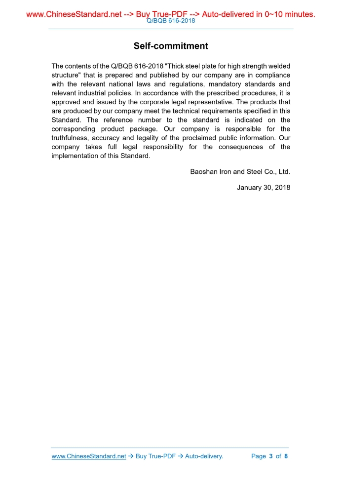 Similar standardsQ/BQB 616-2018: Thick steel plate for high strength welded structure---This is an excerpt. Full copy of true-PDF in English version (including equations, symbols, images, flow-chart, tables, and figures etc.), auto-downloaded/delivered in 9 seconds, can be purchased online: https://www.ChineseStandard.net/PDF.aspx/QBQB616-2018ENTERPRISE STANDARD OF BAOSTEEL CO., LTD. Thick steel plate for high strength welded structure Issued on. January 30, 2018 Issued by. Baoshan Iron and Steel Co., Ltd. Table of ContentsSelf-commitment... 3 Technical indicator 1... 4 1 General technical requirements... 5 2 Dimensions, shapes, weights and tolerances... 5 3 Technical requirements... 5 4 Inspections and tests... 7 Self-commitment The contents of the Q/BQB 616-2018 "Thick steel plate for high strength welded structure" that is prepared and published by our company are in compliance with the relevant national laws and regulations, mandatory standards and relevant industrial policies. In accordance with the prescribed procedures, it is approved and issued by the corporate legal representative. The products that are produced by our company meet the technical requirements specified in this Standard. The reference number to the standard is indicated on the corresponding product package. Our company is responsible for the truthfulness, accuracy and legality of the proclaimed public information. Our company takes full legal responsibility for the consequences of the implementation of this Standard. Baoshan Iron and Steel Co., Ltd. January 30, 2018 Thick steel plate for high strength welded structure This is an indicator requirement document of technical indicator 1.1 General technical requirementsUnless otherwise specified in this Standard, the steel plates that are supplied in accordance with this Standard shall comply with the corresponding requirements of the Q/BQB 600.2 Dimensions, shapes, weights and tolerancesThe higher unevenness accuracies PF.S1 and PF.S2 of the trimmed steel plates shall comply with the requirements of Table 2.Other dimensions, shapes, weights and tolerances shall comply with the provisions of Q/BQB 600. Table 2 Measuring length Higher unevenness accuracy tolerances at different levels, not greater than PF.S1 PF.S2 1000mm 7mm 5mm3 Technical requirements3.1 The steel’s designations and chemical compositions (smelting analysis) shall comply with the requirements of Table 3. ......Source: Above contents are excerpted from the full-copy PDF -- translated/reviewed by: www.ChineseStandard.net / Wayne Zheng et al. |
