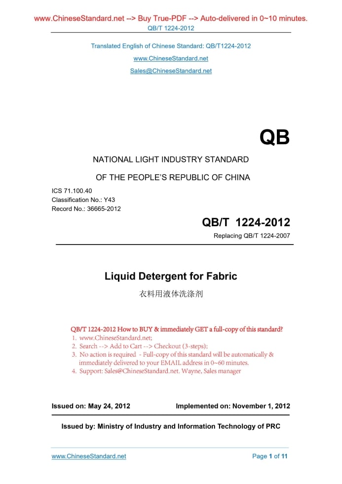QB/T 1224-2012: Liquid Detergent for Fabric Delivery: 9 seconds. True-PDF full-copy in English & invoice will be downloaded + auto-delivered via email. See step-by-step procedure Status: Valid QB/T 1224: Historical versions