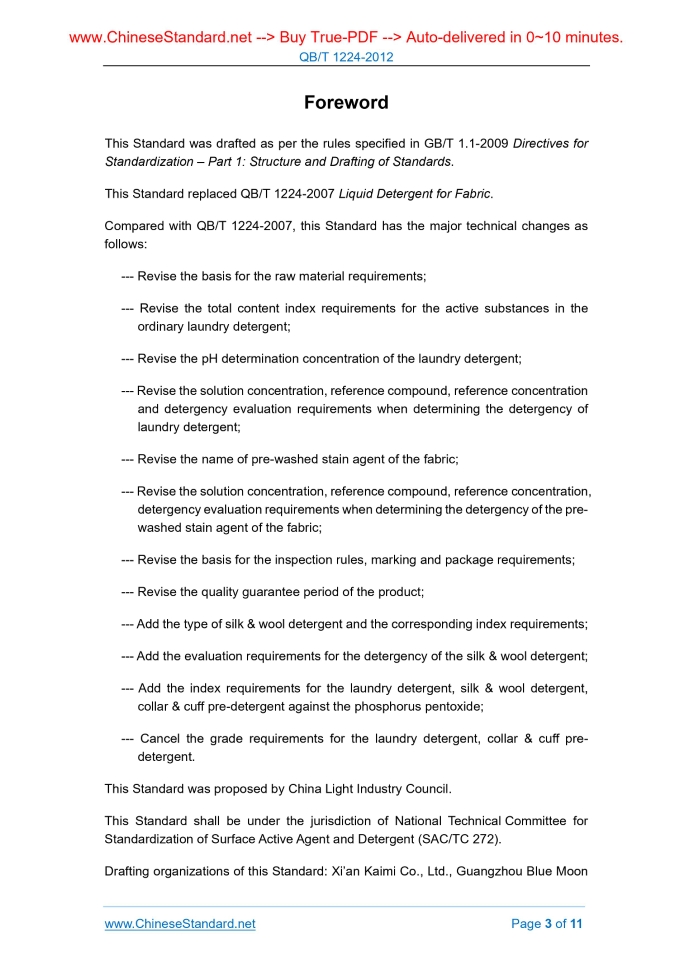 QB/T 1224-2012: Liquid Detergent for Fabric---This is an excerpt. Full copy of true-PDF in English version (including equations, symbols, images, flow-chart, tables, and figures etc.), auto-downloaded/delivered in 9 seconds, can be purchased online: https://www.ChineseStandard.net/PDF.aspx/QBT1224-2012QB NATIONAL LIGHT INDUSTRY STANDARD ICS 71.100.40 Classification No.. Y43 Record No.. 36665-2012 Replacing QB/T 1224-2007 Liquid Detergent for Fabric Issued on. MAY 24, 2012 Implemented on. NOVEMBER 1, 2012 Issued by. Ministry of Industry and Information Technology of PRC Table of ContentsForeword... 3 1 Scope... 5 2 Normative References... 5 3 Terms and Definitions... 6 4 Product Classification and Mark... 6 5 Requirements... 7 6 Test Methods... 8 7 Inspection Rules... 10 8 Marking, Package, Transportation, Storage, Quality Guarantee Period... 10ForewordThis Standard was drafted as per the rules specified in GB/T 1.1-2009 Directives for Standardization – Part 1.Structure and Drafting of Standards. This Standard replaced QB/T 1224-2007 Liquid Detergent for Fabric. Compared with QB/T 1224-2007, this Standard has the major technical changes as follows. --- Revise the basis for the raw material requirements; --- Revise the total content index requirements for the active substances in the ordinary laundry detergent; --- Revise the pH determination concentration of the laundry detergent; --- Revise the solution concentration, reference compound, reference concentration and detergency evaluation requirements when determining the detergency of laundry detergent; --- Revise the name of pre-washed stain agent of the fabric; --- Revise the solution concentration, reference compound, reference concentration, detergency evaluation requirements when determining the detergency of the pre- washed stain agent of the fabric; --- Revise the basis for the inspection rules, marking and package requirements; --- Revise the quality guarantee period of the product; --- Add the type of silk & wool detergent and the corresponding index requirements; --- Add the evaluation requirements for the detergency of the silk & wool detergent; --- Add the index requirements for the laundry detergent, silk & wool detergent, collar & cuff pre-detergent against the phosphorus pentoxide; --- Cancel the grade requirements for the laundry detergent, collar & cuff pre- detergent. This Standard was proposed by China Light Industry Council. This Standard shall be under the jurisdiction of National Technical Committee for Standardization of Surface Active Agent and Detergent (SAC/TC 272). Drafting organizations of this Standard. Xi’an Kaimi Co., Ltd., Guangzhou Blue Moon Industry Co., Ltd., Guangzhou Liby Enterprise Group Co., Ltd., Beijing Lvsan Chemical Co., Ltd., Beijing Luowa Daily Chemical Co., Ltd., Guangzhou Lonkey Industrial Co., Ltd., Unilever (China) Co., Ltd., Kao (China) Holding Co., Ltd., and National Cleaning Products Quality Supervision and Inspection Center (Taiyuan). Chief drafting staffs of this Standard. Yu Wen, Pan Dong, Zhang Liping, Zhao Xinyu, Zhao Jianli, Zhao Jianhong, Shen Jun, Xu Zheng, and Zhang Baolian. The historical editions replaced by this Standard are as follows. --- QB/T 1224-1991, QB/T 1224-2007. Liquid Detergent for Fabric1 ScopeThis Standard specifies the terms and definitions, product classification and mark, requirements, test methods, inspection rules, marking, package, transportation, storage and quality guarantee period of the liquid detergent for fabric. This Standard is applicable to the liquid detergent products (not applicable to the non- washing type products) made from various surface active agents and assistant; used for cleaning various fabrics.2 Normative ReferencesThe following documents are essential to the application of this document. For the dated documents, only the versions with the dates indicated are applicable to this document; for the undated documents, only the latest version (including all the amendments) are applicable to this document. GB/T 6368 Surface Active Agents – Determination of pH of Aqueous Solution – Potentiometric Method GB/T 13173-2008 Surface Active Agents – Detergents – Testing Methods GB/T 13174-2008 Determination of Detergency and Cycle of Washing Property for Laundry Detergents GB/T 26396 Technical Specification for Safety of Soaps and Detergents QB/T 2951 Inspecting Rules for Detergent Products QB/T 2952 Requirements for Detergent Marks and Packaging3 Terms and DefinitionsThe following terms and definitions are applicable to this document. 3.1 Liquid laundry detergent The cleaning product, taking water as the matrix, has certain degree of detergency. Generally used for cleaning various textiles, knitwear, etc. 3.3 Collar & cuff pre-detergent The cleaning product, taking water or water and organic solvent as the matrix, has certain degree of detergency. Generally used for pre-cleaning the collar, cuff and local heavy dirty positions before the entirely washing of the whole clothes. 3.4 Structured laundry detergent A kind of laundry detergent with special internal structure, the product appearance shows the uniform slurry liquid; its internal surface active agent components are regularly polymerized into liquid-crystal structure; and evenly disperse into the continuous water phase; other types of assistant substances,4 Product Classification and Mark4.1 Product classification According to the product using objects, it can be divided into three classes and two types, namely, laundry detergent (ordinary type, concentrated type), silk & wool detergent (ordinary type, concentrated type), and collar & cuff pre-detergent. 4.2 Product mark The ordinary type of product can be marked directly then implement the standard; while the concentrated type of product shall be marked “concentrated type” characters after implementing the standard number.5 Requirements5.1 Basic requirements The various raw materials in the liquid detergent for fabric shall c