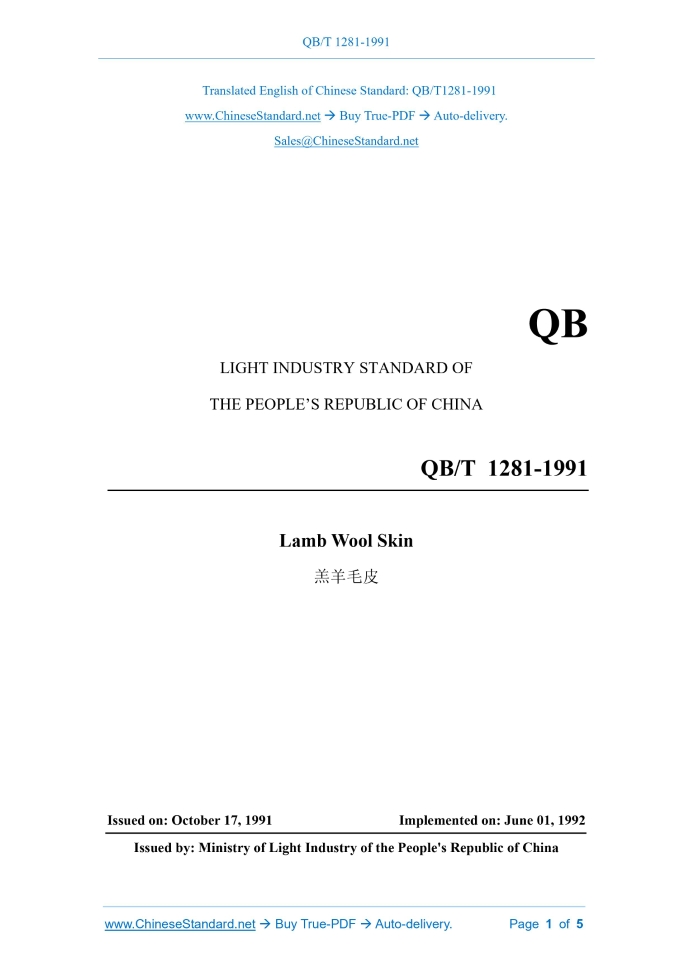 QB/T 1281-1991: Lamb Wool Skin Delivery: 9 seconds. True-PDF full-copy in English & invoice will be downloaded + auto-delivered via email. See step-by-step procedure Status: Obsolete