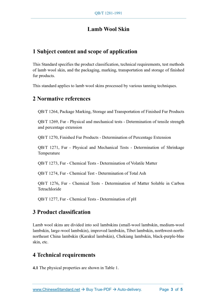 Similar standardsQB/T 1281-1991: Lamb Wool Skin---This is an excerpt. Full copy of true-PDF in English version (including equations, symbols, images, flow-chart, tables, and figures etc.), auto-downloaded/delivered in 9 seconds, can be purchased online: https://www.ChineseStandard.net/PDF.aspx/QBT1281-1991LIGHT INDUSTRY STANDARD OF THE PEOPLE’S REPUBLIC OF CHINA Lamb Wool Skin 羔羊毛皮 Issued on: OCTOBER 17, 1991 Implemented on: JUNE 01, 1992 Issued by. Ministry of Light Industry of the People's Republic of China Table of Contents1 Subject content and scope of application... 3 2 Normative references... 3 3 Product classification... 3 4 Technical requirements... 3 5 Test methods... 4 6 Marking, packaging, transportation and storage... 4 Additional information... 5 Lamb Wool Skin1 Subject content and scope of applicationThis Standard specifies the product classification, technical requirements, test methods of lamb wool skin, and the packaging, marking, transportation and storage of finished fur products. This standard applies to lamb wool skins processed by various tanning techniques.2 Normative referencesQB/T 1264, Package Marking, Storage and Transportation of Finished Fur Products QB/T 1269, Fur - Physical and mechanical tests - Determination of tensile strength and percentage extension QB/T 1270, Finished Fur Products - Determination of Percentage Extension QB/T 1271, Fur - Physical and Mechanical Tests - Determination of Shrinkage Temperature QB/T 1273, Fur - Chemical Tests - Determination of Volatile Matter QB/T 1274, Fur - Chemical Test - Determination of Total Ash QB/T 1276, Fur - Chemical Tests - Determination of Matter Soluble in Carbon Tetrachloride QB/T 1277, Fur - Chemical Tests - Determination of pH3 Product classificationLamb wool skins are divided into soil lambskins (small-wool lambskin, medium-wool lambskin, large-wool lambskin), improved lambskin, Tibet lambskin, northwest-north- northeast China lambskin (Karakul lambskin), Chekiang lambskin, black-purple-blue skin, etc.4 Technical requirements4.1 The physical properties are shown in Table 1. ......Source: Above contents are excerpted from the full-copy PDF -- translated/reviewed by: www.ChineseStandard.net / Wayne Zheng et al. Tips & Frequently Asked Questions:Question 1: How long will the true-PDF of English version of QB/T 1281-1991 be delivered?Answer: The full copy PDF of English version of QB/T 1281-1991 can be downloaded in 9 seconds, and it will also be emailed to you in 9 seconds (double mechanisms to ensure the delivery reliably), with PDF-invoice.Question 2: Can I share the purchased PDF of QB/T 1281-1991_English with my colleagues?Answer: Yes. The purchased PDF of QB/T 1281-1991_English will be deemed to be sold to your employer/organization who actually paid for it, including your colleagues and your employer's intranet.Question 3: Does the price include tax/VAT?Answer: Yes. Our tax invoice, downloaded/delivered in 9 seconds, includes all tax/VAT and complies with 100+ countries' tax regulations (tax exempted in 100+ countries) -- See Avoidance of Double Taxation Agreements (DTAs): List of DTAs signed between Singapore and 100+ countriesQuestion 4: Do you accept my currency other than USD?Answer: Yes. www.ChineseStandard.us -- QB/T 1281-1991 -- Click this link and select your country/currency to pay, the exact amount in your currency will be printed on the invoice. Full PDF will also be downloaded/emailed in 9 seconds.How to buy and download a true PDF of English version of QB/T 1281-1991?A step-by-step guide to download PDF of QB/T 1281-1991_EnglishStep 1: Visit website https://www.ChineseStandard.net (Pay in USD), or https://www.ChineseStandard.us (Pay in any currencies such as Euro, KRW, JPY, AUD).Step 2: Search keyword "QB/T 1281-1991". Step 3: Click "Add to Cart". If multiple PDFs are required, repeat steps 2 and 3 to add up to 12 PDFs to cart. Step 4: Select payment option (Via payment agents Stripe or PayPal). Step 5: Customize Tax Invoice -- Fill up your email etc. Step 6: Click "Checkout". Step 7: Make payment by credit card, PayPal, Google Pay etc. After the payment is completed and in 9 seconds, you will receive 2 emails attached with the purchased PDFs and PDF-invoice, respectively. Step 8: Optional -- Go to download PDF. Step 9: Optional -- Click Open/Download PDF to download PDFs and invoice. See screenshots for above steps: Steps 1~3 Steps 4~6 Step 7 Step 8 Step 9 |