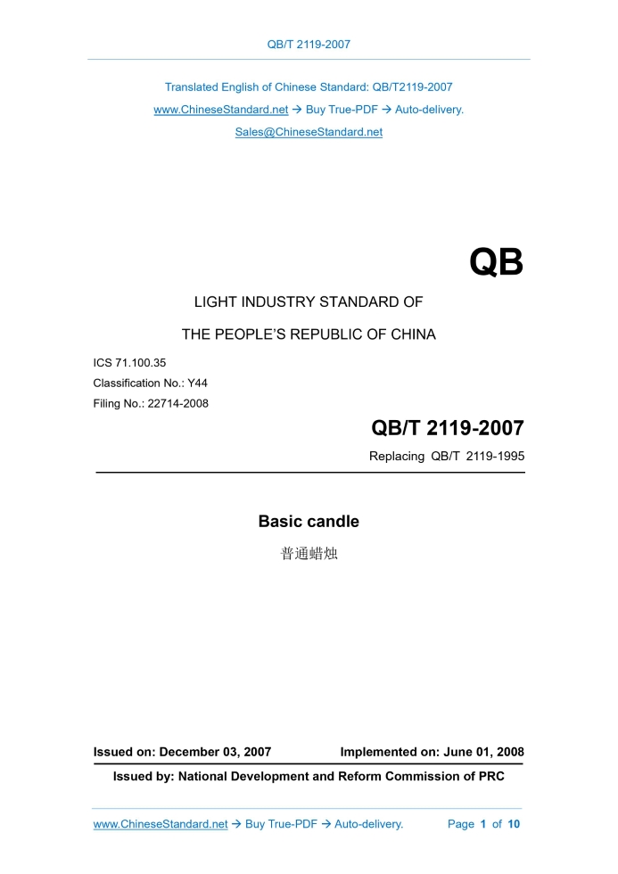 QB/T 2119-2007: Basic candle Delivery: 9 seconds. True-PDF full-copy in English & invoice will be downloaded + auto-delivered via email. See step-by-step procedure Status: Valid QB/T 2119: Historical versions