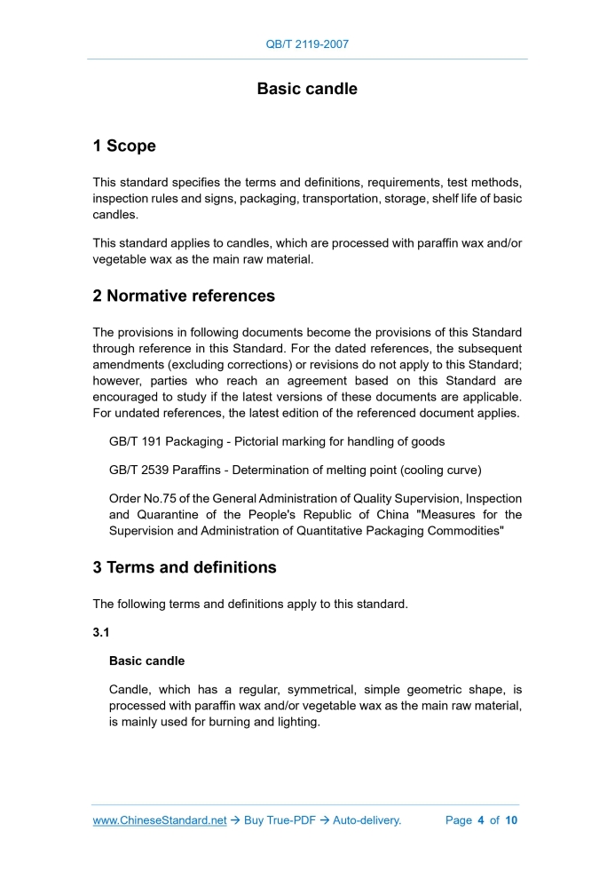 Similar standardsQB/T 2119-2007: Basic candle---This is an excerpt. Full copy of true-PDF in English version (including equations, symbols, images, flow-chart, tables, and figures etc.), auto-downloaded/delivered in 9 seconds, can be purchased online: https://www.ChineseStandard.net/PDF.aspx/QBT2119-2007QB LIGHT INDUSTRY STANDARD OF THE PEOPLE’S REPUBLIC OF CHINA ICS 71.100.35 Classification No.. Y44 Filing No.. 22714-2008 Replacing QB/T 2119-1995 Basic candle Issued on. DECEMBER 03, 2007 Implemented on. JUNE 01, 2008 Issued by. National Development and Reform Commission of PRC Table of ContentsForeword... 3 1 Scope... 4 2 Normative references... 4 3 Terms and definitions... 4 4 Requirements... 5 5 Test method... 5 6 Inspection rules... 8 7 Marking, packaging, transportation, storage, shelf life... 9ForewordThis standard is a revision of QB/T 2119-1995 "Basic candles". Compared with QB/T 2119-1995, the main changes of this standard are as follows. - This standard was compiled, with reference to the German standard RAL- GZ 041/1 (2005) "General Quality and Inspection Specifications for Candles", American Society for Testing and Materials Standard ASTM F 2417-2004 "Standard Specification for Fire Safety for Candles"; - ADD the indicator of odor; - CHANGE the original wax texture index into the appearance index; - CHANGE the original vertical skewness index into the product placement stability index; - ADD the combustion performance index; - ADD the flame height index; - ADD the combustion afterglow index; - ADD the light stability index; - ADD the net content index. This standard was proposed by the China National Light Industry Council. This standard shall be under the jurisdiction of the National Standardization Center for Toothpaste and Wax Products. Drafting organizations of this standard. National Light Industry Toothpaste Wax Products Quality Supervision and Testing Center, Qingdao Jinwang Applied Chemical Co., Ltd., Zhongshan Zhongnan Candle Co., Ltd., Dongguan Quanwei Candle Co., Ltd., Dingzhou Jinqiao Candle Co., Ltd. The main drafters of this standard. Wang Fawen, Sun Dongfang, Wang Changyu, Li Xianbo. This standard has replaced the original light industry standard QB/T 2119-1995 "Basic candles", which was issued by the original Light Industry Council, from the date of its implementation. This standard was first published in 1995.This is the first revision. Basic candle1 ScopeThis standard specifies the terms and definitions, requirements, test methods, inspection rules and signs, packaging, transportation, storage, shelf life of basic candles. This standard applies to candles, which are processed with paraffin wax and/or vegetable wax as the main raw material.2 Normative referencesThe provisions in following documents become the provisions of this Standard through reference in this Standard. For the dated references, the subsequent amendments (excluding corrections) or revisions do not apply to this Standard; however, parties who reach an agreement based on this Standard are encouraged to study if the latest versions of these documents are applicable. For undated references, the latest edition of the referenced document applies. GB/T 191 Packaging - Pictorial marking for handling of goods3 Terms and definitionsThe following terms and definitions apply to this standard.4 Requirements4.1 Sensory requirements Sensory requirements shall meet the requirements of Table 1. 4.2 Physical and chemical requirements The physical and chemical requirements shall meet the requirements of Table 2. 4.3 Net content The net content shall comply with the provisions of Order No.75 of the General Administration of Quality Supervision, Inspection and Quarantine of the People's Republic of China.5 Test method5.1 Sensory requirements 5.1.1 Appearance Take 4 samples. Perform visual inspection. 5.2 Physical and chemical requirements 5.2.1 Exposed length of wax core Take 4 samples. Use a vernier caliper to measure the candle. Each candle shall meet the requirements of the standard. Take the maximum value of the test results among the 4 candles, as the final test result. 5.2.4 Melting point Determine it in accordance with the provisions of GB/T 2539. 5.2.5 Burning performance Take 4 samples. Place them at an interval of 200 mm, at a room temperature of 15°C ~ 25°C, without strong air convection. After lighting the candle for 15 min, observe the burning situation, until it is completely extinguished. The flame shall be stable, burning silently, without self-extinguishing, no wax flow (a small amount of wax flow is allowed, but not flowing out of the candle); there is no black smoke, which is invisible to the naked eye. 5.2.6 Flame height Take 4 samples. Burn it for 30 min and 1 h, respectively, at room temperature of 15 °C ~ 25 °C, without strong air convection. Respectively use a steel ruler, to measure the height of the lowest point and highest point of the flame. Take the maximum of the two test results as the final test result. 5.2.8 Thermal stability 5.2.8.1 Main instrument Constant temperature incubator. Accuracy ±1 °C. 5.2.8.2 Measurement procedure Take a small package of samples (not less than 4 pcs). Place it flat in a constant temperature incubator at (35 ± 1) °C. Keep it for 24 hours. Take it out to restore to room temperature. Observe whether there is merging, deformation, discoloration, waxing. 5.2.10 Light stability 5.2.10.1 Instrument 5.3 Net content Take 10 samples for weighing. Compare with the marked net content. It shall meet the requirements of Order No.75 of the General Administration of Quality Supervision, Inspection and Quarantine.6 Inspection rules6.1 Inspection classification Product inspection is divided into exit-factory inspection and type inspection. 6.1.3 Group-batch and sampling The products of the same batching and same specification form a batch. From each batch of products, randomly take the sample which meet the inspection quality requirements, which shall pass t