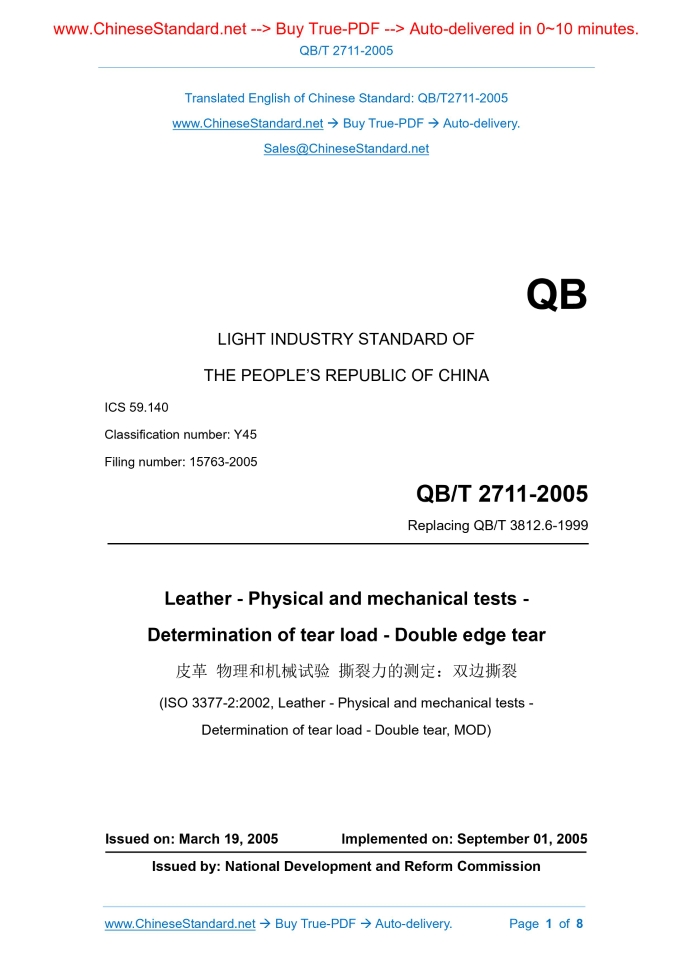 QB/T 2711-2005: Leather. Physical and mechanical tests. Determination of tear load. Double edge tear Delivery: 9 seconds. True-PDF full-copy in English & invoice will be downloaded + auto-delivered via email. See step-by-step procedure Status: Valid