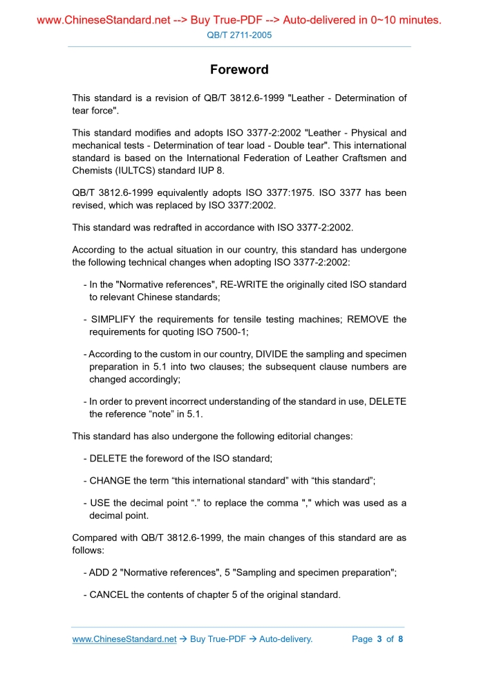 Similar standardsQB/T 2711-2005: Leather. Physical and mechanical tests. Determination of tear load. Double edge tear---This is an excerpt. Full copy of true-PDF in English version (including equations, symbols, images, flow-chart, tables, and figures etc.), auto-downloaded/delivered in 9 seconds, can be purchased online: https://www.ChineseStandard.net/PDF.aspx/QBT2711-2005 LIGHT INDUSTRY STANDARD OF THE PEOPLE’S REPUBLIC OF CHINA ICS 59.140 Classification number. Y45 Filing number. 15763-2005 Replacing QB/T 3812.6-1999 Leather - Physical and mechanical tests - Determination of tear load - Double edge tear (ISO 3377-2.2002, Leather - Physical and mechanical tests - Determination of tear load - Double tear, MOD) Issued on: MARCH 19, 2005 Implemented on: SEPTEMBER 01, 2005 Issued by. National Development and Reform Commission Table of ContentsForeword... 3 1 Scope... 5 2 Normative references... 5 3 Principle... 5 4 Device... 5 5 Sampling and specimen preparation... 7 6 Procedure... 7 7 Test report... 7ForewordThis standard is a revision of QB/T 3812.6-1999 "Leather - Determination of tear force". This standard modifies and adopts ISO 3377-2.2002 "Leather - Physical and mechanical tests - Determination of tear load - Double tear". This international standard is based on the International Federation of Leather Craftsmen and Chemists (IULTCS) standard IUP 8. QB/T 3812.6-1999 equivalently adopts ISO 3377.1975.ISO 3377 has been revised, which was replaced by ISO 3377.2002. This standard was redrafted in accordance with ISO 3377-2.2002. According to the actual situation in our country, this standard has undergone the following technical changes when adopting ISO 3377-2.2002. - In the "Normative references", RE-WRITE the originally cited ISO standard to relevant Chinese standards; - SIMPLIFY the requirements for tensile testing machines; REMOVE the requirements for quoting ISO 7500-1; - According to the custom in our country, DIVIDE the sampling and specimen preparation in 5.1 into two clauses; the subsequent clause numbers are changed accordingly; - In order to prevent incorrect understanding of the standard in use, DELETE the reference “note” in 5.1. This standard has also undergone the following editorial changes. - DELETE the foreword of the ISO standard; - CHANGE the term “this international standard” with “this standard”; - USE the decimal point “.” to replace the comma "," which was used as a decimal point. Compared with QB/T 3812.6-1999, the main changes of this standard are as follows. - ADD 2 "Normative references", 5 "Sampling and specimen preparation"; - CANCEL the contents of chapter 5 of the original standard. Leather - Physical and mechanical tests - Determination of tear load - Double edge tear1 ScopeThis standard specifies the method for measuring the tear force of leather - the double edge tear method (Baumann tear). This standard applies to all types of leather.2 Normative referencesThe provisions in following documents become the provisions of this Standard through reference in this Standard. For the dated references, the subsequent amendments (excluding corrections) or revisions do not apply to this Standard; however, parties who reach an agreement based on this Standard are encouraged to study if the latest versions of these documents are applicable. For undated references, the latest edition of the referenced document applies. QB/T 2706 Leather - Chemical physical and mechanical and fastness tests - Sampling location (ISO 2418.2002, MOD) QB/T 2707 Leather - Physical and mechanical tests - Sample preparation and conditioning (ISO 2419.2006, MOD) QB/T 2709 Leather - Physical and mechanical tests - Determination of thickness (ISO 2589.2002, MOD)3 PrincipleThe rectangular specimen of the specified shape (with a hole in the middle) is placed on the test hooks of the upper and lower fixtures of the tensile testing machine. The maximum force reached when the tensile testing machine is running is the tear force of the specimen.4 Device4.1 Tensile testing machine Figure 2 -- Shape of specimen5 Sampling and specimen preparation5.1 Sampling It is performed according to the provisions of QB/T 2706-2005. 5.2 Preparation of specimen According to the provisions of QB/T 2707-2005, use a die knife (4.4) to cut 6 specimens from the grain surface, wherein the long sides of 3 specimens are parallel to the ridge line, the long sides of the other 3 specimens are perpendicular to the ridge line. 5.3 Air conditioning of specimen It is performed according to the provisions of QB/T 2707-2005. 5.4 Determination of specimen thickness Measure the thickness of the specimen according to the provisions of QB/T 2709-2005.6 Procedure6.1 Adjust the tensile testing machine so that the hooks of the two test hooks lightly touch. Put the hole of the specimen into the hook part of the two test hooks. The wide side of the test hook is parallel to the straight side of the specimen hole, so that the specimen cannot fall off. 6.2 Start the tensile testing machine until the specimen tears. Record the maximum force value. 6.3 Repeat 6.1 ~ 6.2 to test other specimens.7 Test reportThe test report should include the following. a) This standard number; b) Sample name, number and type; c) Detailed information of the specimen, inconsistency between the sampling and QB/T 2706-2005; ......Source: Above contents are excerpted from the full-copy PDF -- translated/reviewed by: www.ChineseStandard.net / Wayne Zheng et al. Tips & Frequently Asked Questions:Question 1: How long will the true-PDF of English version of QB/T 2711-2005 be delivered?Answer: The full copy PDF of English version of QB/T 2711-2005 can be downloaded in 9 seconds, and it will also be emailed to you in 9 seconds (double mechanisms to ensure the delivery reliably), with PDF-invoice.Question 2: Can I share the purchased PDF of QB/T 2711-2005_English with my colleagues?Answer: Yes. The purchased PDF of QB/T 2711-2005_English will be deemed to b