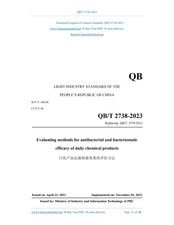 QB/T 2738-2023: Evaluating methods for antibacterial and bacteriostatic efficacy of daily chemical products Delivery: 9 seconds. True-PDF full-copy in English & invoice will be downloaded + auto-delivered via email. See step-by-step procedure Status: Valid QB/T 2738: Historical versions