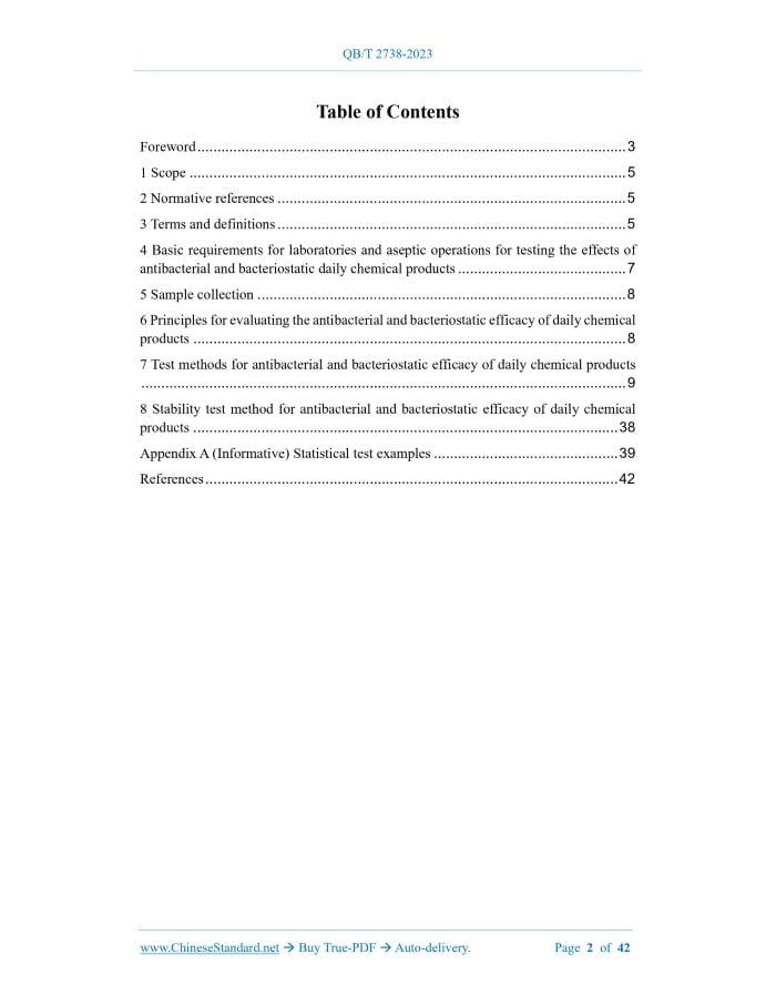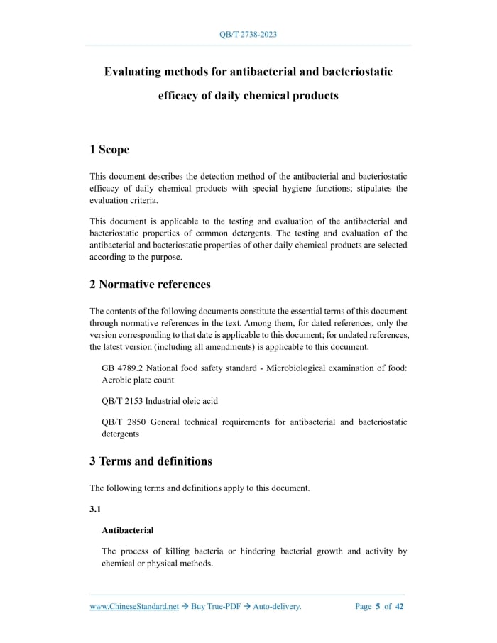 Similar standardsQB/T 2738-2023: Evaluating methods for antibacterial and bacteriostatic efficacy of daily chemical products---This is an excerpt. Full copy of true-PDF in English version (including equations, symbols, images, flow-chart, tables, and figures etc.), auto-downloaded/delivered in 9 seconds, can be purchased online: https://www.ChineseStandard.net/PDF.aspx/QBT2738-2023 QB LIGHT INDUSTRY STANDARD OF THE PEOPLE��S REPUBLIC OF CHINA ICS 71.100.40 CCS Y 40 Replacing QB/T 2738-2012 Evaluating methods for antibacterial and bacteriostatic efficacy of daily chemical products Issued on. APRIL 21, 2023 Implemented on. NOVEMBER 01, 2023 Issued by. Ministry of Industry and Information Technology of PRC Table of ContentsForeword... 3 1 Scope... 5 2 Normative references... 5 3 Terms and definitions... 5 4 Basic requirements for laboratories and aseptic operations for testing the effects of antibacterial and bacteriostatic daily chemical products... 7 5 Sample collection... 8 6 Principles for evaluating the antibacterial and bacteriostatic efficacy of daily chemical products... 8 7 Test methods for antibacterial and bacteriostatic efficacy of daily chemical products ... 9 8 Stability test method for antibacterial and bacteriostatic efficacy of daily chemical products... 38 Appendix A (Informative) Statistical test examples... 39 References... 421 ScopeThis document describes the detection method of the antibacterial and bacteriostatic efficacy of daily chemical products with special hygiene functions; stipulates the evaluation criteria. This document is applicable to the testing and evaluation of the antibacterial and bacteriostatic properties of common detergents. The testing and evaluation of the antibacterial and bacteriostatic properties of other daily chemical products are selected according to the purpose.2 Normative referencesThe contents of the following documents constitute the essential terms of this document through normative references in the text. Among them, for dated references, only the version corresponding to that date is applicable to this document; for undated references, the latest version (including all amendments) is applicable to this document. GB 4789.2 National food safety standard - Microbiological examination of food. Aerobic plate count QB/T 2153 Industrial oleic acid QB/T 2850 General technical requirements for antibacterial and bacteriostatic detergents3 Terms and definitionsThe following terms and definitions apply to this document. 3.1 Antibacterial The process of killing bacteria or hindering bacterial growth and activity by chemical or physical methods. 3.2 Bacteriostasis The process of inhibiting or hindering bacterial growth and activity by chemical or physical methods. 3.3 Carrier The support for test microorganisms. 3.4 Colony forming unit (CFU) In the counting of live bacteria, the colony expressing the number of live bacteria formed by the growth and reproduction of a single bacterium or multiple bacteria in a cluster on a solid culture medium. 3.5 Neutralizer In the microbial killing test, it is a reagent used to neutralize the suspension of the test microorganism and the bactericide and the residual bactericide on the surface of the microorganism, so that it loses its inhibitory and killing effects on the microorganism. 3.6 Product of neutralization The product after the neutralizer (3.5) reacts with the bactericide.4 Basic requirements for laboratories and aseptic operations for testing the effects of antibacterial and bacteriostatic dailychemical products 4.1 Microbiological laboratories shall adopt a closed layout; the building shall be easy to clean and disinfect. 4.2 Before the start of the test, the table and the indoor floor shall be cleaned by wet methods; then the air in the laboratory shall be disinfected by ultraviolet rays or other methods. 4.3 Experimenters shall wear work clothes, masks, hats; when conducting sterility tests, they shall enter the laboratory after air showering. Then, wear sterile isolation clothes, hats, masks correctly. 4.4 The sterile pipette shall be replaced every time a different sample is drawn; the inoculation loop (needle) shall be burned and sterilized on the flame before it can be used again. 4.6 Reagents that require sterility, such as distilled water, phosphate buffer, culture medium, bovine serum albumin, standard hard water, neutralizer, etc., shall be sterilized or filtered. 4.7 Before using sterile equipment and reagents, check whether the container or packaging is intact. If damaged, it shall not be used. 4.8 Sterile equipment and reagents in use shall not be exposed to the air for a long time. 4.9 When pipetting or inoculating, the mouth of the test tube and the agar plate shall be close to the flame to prevent contamination. 4.10 All used contaminated equipment shall be immediately placed in a container containing disinfectant, to prevent contamination of the surrounding environment and clean items.5 Sample collectionIn order to make the samples representative, at least 12 minimum sales packaging samples shall be randomly selected from the three transport packages of the same batch number, of which 4 samples shall be retained, 4 samples shall be tested for antibacterial or bactericidal performance, 4 samples shall be tested for stability.6 Principles for evaluating the antibacterial and bacteriostatic efficacy of daily chemical products6.1 Bactericidal test determination method The bactericidal test determination method in the document is used to evaluate the antibacterial effect of the product. 6.2 Bacteriostatic test determination method The bacteriostatic test determination method in the document is used to evaluate the bacteriostatic effect of the product. 6.3 Indicator microorganisms for inspection The test bacteria in Table 1 shall be selected and tested according to the product implementation standard or the scope of application of the instructions. Other strains can also be added as tes