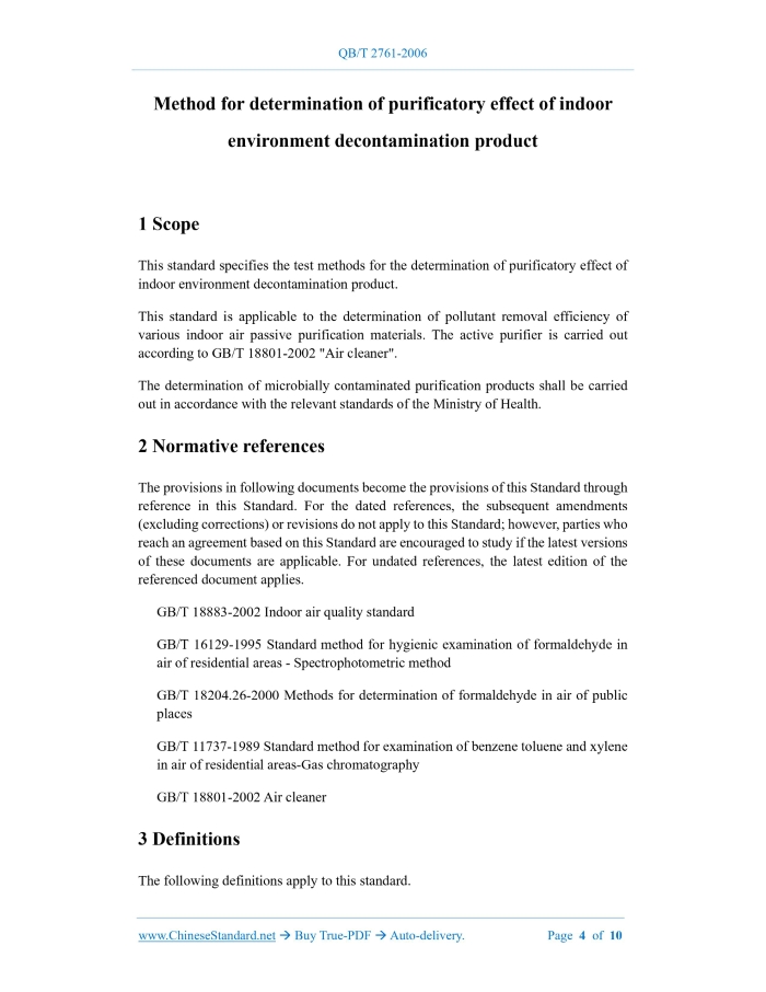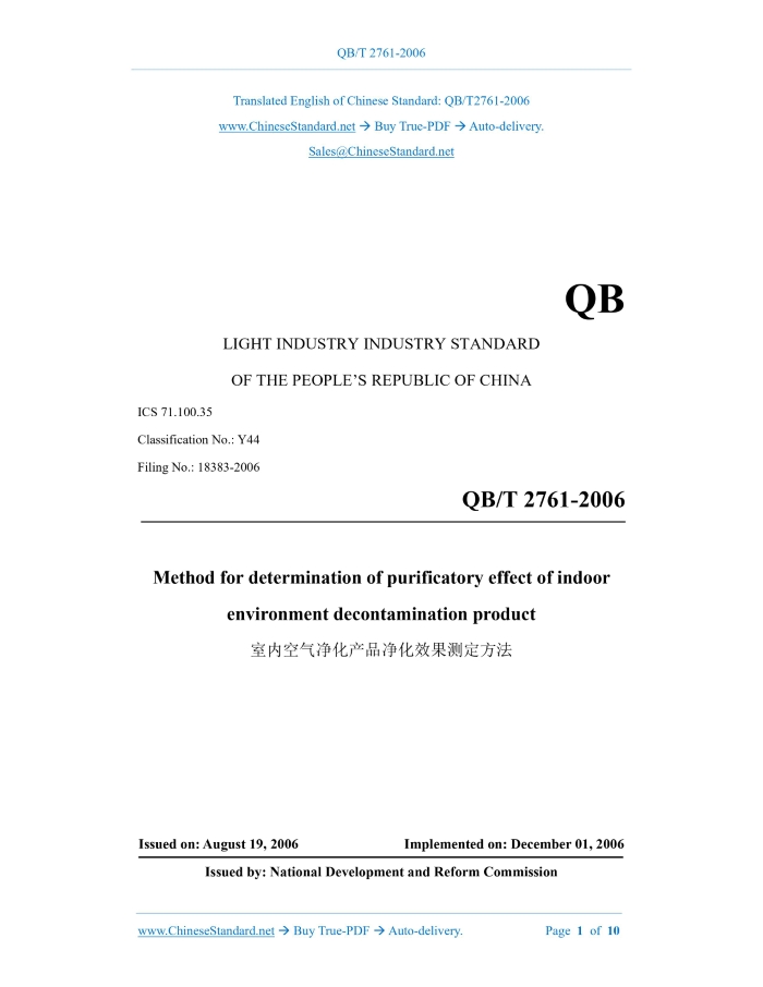 QB/T 2761-2006: Methods for determination of purificatory effect of indoor environment decontamination product Delivery: 9 seconds. True-PDF full-copy in English & invoice will be downloaded + auto-delivered via email. See step-by-step procedure Status: Obsolete QB/T 2761: Historical versions