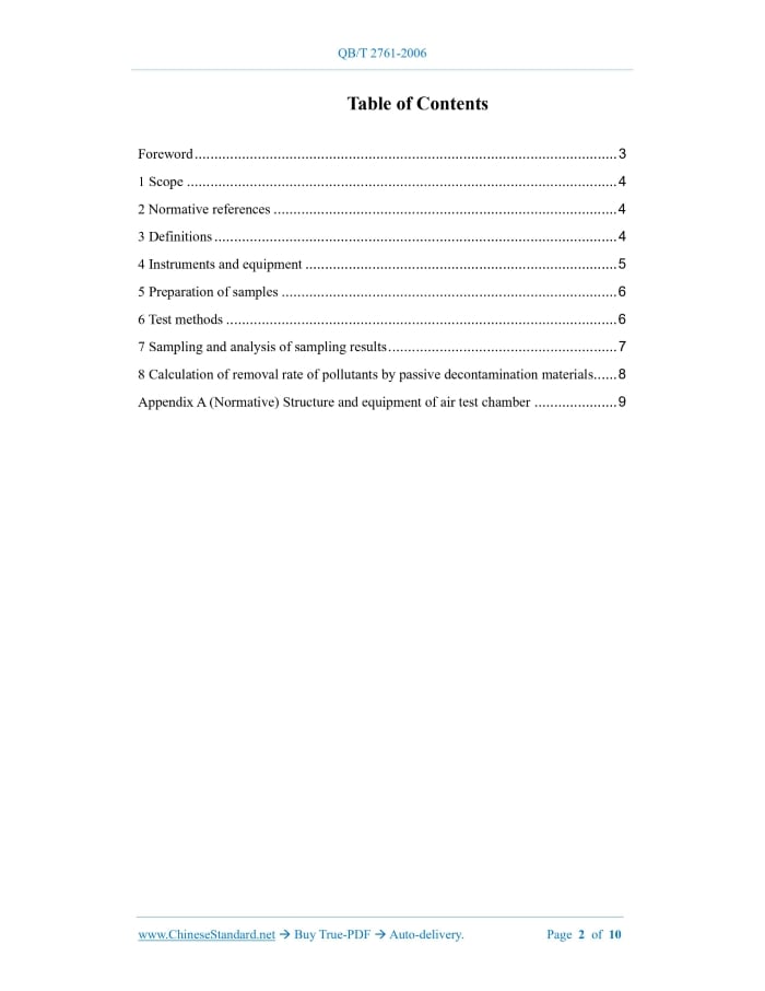 Similar standardsQB/T 2761-2006: Methods for determination of purificatory effect of indoor environment decontamination product---This is an excerpt. Full copy of true-PDF in English version (including equations, symbols, images, flow-chart, tables, and figures etc.), auto-downloaded/delivered in 9 seconds, can be purchased online: https://www.ChineseStandard.net/PDF.aspx/QBT2761-2006 QB LIGHT INDUSTRY INDUSTRY STANDARD ICS 71.100.35 Classification No.. Y44 Filing No.. 18383-2006 Method for determination of purificatory effect of indoor environment decontamination product Issued on: AUGUST 19, 2006 Implemented on: DECEMBER 01, 2006 Issued by. National Development and Reform Commission Table of ContentsForeword... 3 1 Scope... 4 2 Normative references... 4 3 Definitions... 4 4 Instruments and equipment... 5 5 Preparation of samples... 6 6 Test methods... 6 7 Sampling and analysis of sampling results... 7 8 Calculation of removal rate of pollutants by passive decontamination materials... 8 Appendix A (Normative) Structure and equipment of air test chamber... 9 Method for determination of purificatory effect of indoor environment decontamination product1 ScopeThis standard specifies the test methods for the determination of purificatory effect of indoor environment decontamination product. This standard is applicable to the determination of pollutant removal efficiency of various indoor air passive purification materials. The active purifier is carried out according to GB/T 18801-2002 "Air cleaner". The determination of microbially contaminated purification products shall be carried out in accordance with the relevant standards of the Ministry of Health.2 Normative referencesThe provisions in following documents become the provisions of this Standard through reference in this Standard. For the dated references, the subsequent amendments (excluding corrections) or revisions do not apply to this Standard; however, parties who reach an agreement based on this Standard are encouraged to study if the latest versions of these documents are applicable. For undated references, the latest edition of the referenced document applies. GB/T 18883-2002 Indoor air quality standard GB/T 16129-1995 Standard method for hygienic examination of formaldehyde in air of residential areas - Spectrophotometric method GB/T 18204.26-2000 Methods for determination of formaldehyde in air of public places GB/T 11737-1989 Standard method for examination of benzene toluene and xylene in air of residential areas-Gas chromatography GB/T 18801-2002 Air cleaner3 DefinitionsThe following definitions apply to this standard. 4.4 Activated carbon sampling tube. 4.5 Spectrophotometer. It has a wavelength of 500 nm AND is equipped with a cuvette which has a light path of 10 mm. 4.6 Gas chromatograph. It is equipped with hydrogen flame ionization detector. 4.7 Portable formaldehyde detector. 4.8 1.5m3 air test chamber. See Appendix A.5 Preparation of samplesFor the passive decontamination materials, prepare appropriate test samples according to the product instructions. For products without product instructions, spray (coat) the decontamination material three times, on three sheets of 1 m2 base paper (requires inert material) (use a small spray pump to spray as fine mist as possible). After the first course of spraying is finished and dry, spray the second cause. After the second course is dry, spray the third course (the material consumption for brushing. 200 g; the material consumption for spraying. 100 g).6 Test methods6.1 General conditions of test Use two air test chambers (A is blank chamber, B is sample chamber), to test the concentration of gaseous pollutants, which are removed by the decontamination product. The test is carried out at normal temperature and normal pressure. 6.2 Requirements for test chamber See Appendix A. 6.3 Pretreatment of test chamber 6.3.1 The air test chamber shall be clean, to purify the air quality in the chamber to the maximum extent AND ensure that there are no pollutants. 6.3.2 Before the test, it shall make the release curve of the release source, for the two cabins, respectively. The routine test shall be carried out, after they are basically parallel. 6.4 Preparation of release source Roll 5 layers of 17 cm □ 40 cm [Translator. should be 17cm × 40cm] medical degreased gauze, on two glass rods, which have a diameter of 5 mm and a length of 30 cm. Use cotton threads to fix it. Place them upright in a 500 mL reagent bottle. Load 200 mL of pollutants, which have a concentration of 0.2% formaldehyde, 1% ammonia, 0.06% benzene, 0.1% toluene, 0.4% xylene, respectively. TVOC is prepared according to the specified proportions of benzene, toluene, xylene. All reagents are of analytical grade. The container is labeled with A1 and B1.After the gauze is completely wet, it can be put into use. 6.5 Experimental steps 6.5.1 Hang the untreated base paper in the blank test chamber A. Then hang the base paper with the sprayed decontamination material in the test chamber B. OR place the prototype of the purifier to be tested in the middle of the test chamber B. 6.5.2 Place the containers, which have the prepared pollutant release sources A1 and B1 in blank test chamber A and sample test chamber B, respectively. Close the doors immediately. 6.5.3 Turn on the fans of the blank test chamber A and the sample test chamber B. Stir for 1 min, to mix the air in the chamber with the pollutants released by the release source. Turn off the fans, at the same time, to sample the air in the blank chamber. Measure the concentration of pollutants in the air in the blank cabin, which is the initial concentration, denoted as C0. 6.5.4 After 24 hours, sample the concentration of air pollutants in the two cabins. Analyze and test, that is, the concentration values of cabins A and B within a certain period of time, denoted as CA and CB.7 Sampling and analysis of sampling results7.1 Sampling method Connect the air outlet to the sam