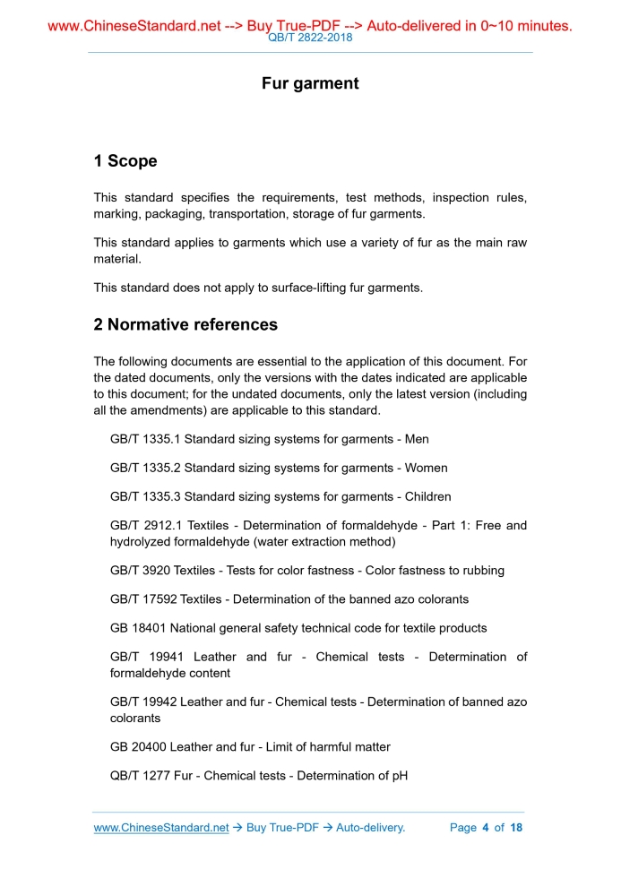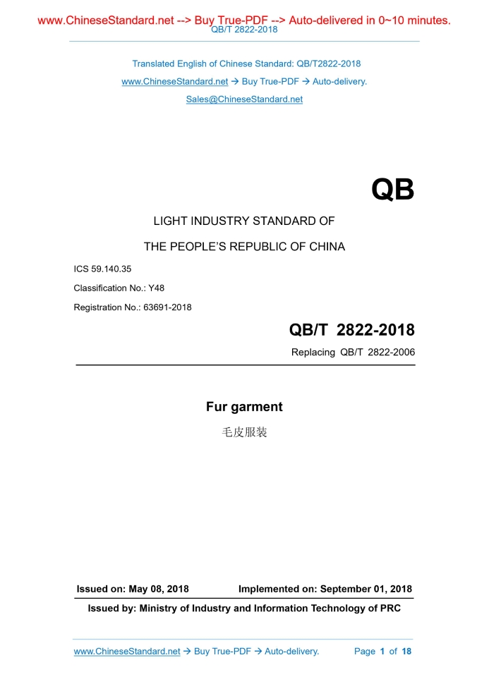 QB/T 2822-2018: Fur garment Delivery: 9 seconds. True-PDF full-copy in English & invoice will be downloaded + auto-delivered via email. See step-by-step procedure Status: Valid QB/T 2822: Historical versions