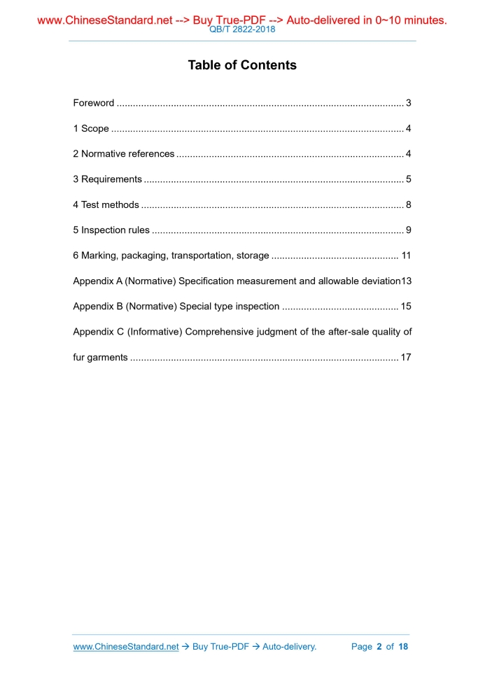 QB/T 2822-2018: Fur garment---This is an excerpt. Full copy of true-PDF in English version (including equations, symbols, images, flow-chart, tables, and figures etc.), auto-downloaded/delivered in 9 seconds, can be purchased online: https://www.ChineseStandard.net/PDF.aspx/QBT2822-2018LIGHT INDUSTRY STANDARD OF THE PEOPLE’S REPUBLIC OF CHINA ICS 59.140.35 Classification No.: Y48 Registration No.: 63691-2018 Replacing QB/T 2822-2006 Fur garment 毛皮服装 ISSUED ON: MAY 08, 2018 IMPLEMENTED ON: SEPTEMBER 01, 2018 Issued by: Ministry of Industry and Information Technology of PRC Table of ContentsForeword ... 3 1 Scope ... 4 2 Normative references ... 4 3 Requirements ... 5 4 Test methods ... 8 5 Inspection rules ... 9 6 Marking, packaging, transportation, storage ... 11 Appendix A (Normative) Specification measurement and allowable deviation13 Appendix B (Normative) Special type inspection ... 15 Appendix C (Informative) Comprehensive judgment of the after-sale quality of fur garments ... 17 Fur garment1 ScopeThis standard specifies the requirements, test methods, inspection rules, marking, packaging, transportation, storage of fur garments. This standard applies to garments which use a variety of fur as the main raw material. This standard does not apply to surface-lifting fur garments.2 Normative referencesThe following documents are essential to the application of this document. For the dated documents, only the versions with the dates indicated are applicable to this document; for the undated documents, only the latest version (including all the amendments) are applicable to this standard. GB/T 1335.1 Standard sizing systems for garments - Men GB/T 1335.2 Standard sizing systems for garments - Women GB/T 1335.3 Standard sizing systems for garments - Children GB/T 2912.1 Textiles - Determination of formaldehyde - Part 1: Free and hydrolyzed formaldehyde (water extraction method) GB/T 3920 Textiles - Tests for color fastness - Color fastness to rubbing GB/T 17592 Textiles - Determination of the banned azo colorants GB 18401 National general safety technical code for textile products GB/T 19941 Leather and fur - Chemical tests - Determination of formaldehyde content GB/T 19942 Leather and fur - Chemical tests - Determination of banned azo colorants GB 20400 Leather and fur - Limit of harmful matter QB/T 1277 Fur - Chemical tests - Determination of pH4 Test methods4.1 Devices and conditions 4.1.1 Measurement tools Steel ruler: The minimum scale is 0.5 mm (for measuring stitching distance), 1 mm. Steel tape measure: The minimum scale is 1 mm. 4.1.2 Test bench The length, width, height are appropriate. The surface of bench is flat. The sample can be flattened on the bench. 4.1.3 Illuminance It is no less than 750 lx 4.2 Model and specifications 4.2.1 Representation of model The inspection shall be carried out in accordance with the provisions of GB/T 1335.1, GB/T 1335.2 and GB/T 1335.3. 4.2.2 Allowable deviation of specifications When the relevant party disagrees with the specifications and the allowable deviation, it shall be inspected according to the design requirements and Appendix A. 4.3 Fur raw materials (including leather, double-face leather) Before cutting and making, carry out inspection according to the provisions of such standards as GB 20400, QB/T 1280, QB/T 1284, QB/T 1286, QB/T 2923, QB/T 4203, QB/T 4366, QB/T 1872, QB/T 2536. 4.4 Textiles Before cutting and making, carry out inspection according to Appendix B. 4.5 Stitch length Use a steel ruler to measure more than 30 mm in any part of the finished product (except for thick-thin parts and embroidery parts). 4.6 Other items A single product that does not meet the requirements specified in this standard constitutes a defect. According to the product's non-compliance with the standard and the impact on the product's performance and appearance, the defects are divided into three categories: a) Minor defects: The defects which have slight non-compliance with the standard, but does not affect the use performance of the product, and a small impact onto the appearance of products are called minor defects; b) General defects: The defects which have serious non-compliance with the standard, but does not affect the use performance of the product, and a small impact onto the appearance of products are called general defects; c) Severe defects: The defects which seriously reduce and impact the basic use function and seriously affect the appearance of products are called severe defects. 5.5.2 Basis for determination of defects Determined by degree of defects: a) Minor defects: The defects in the quantitative indicators that exceed (inclusive) 50% of the standard value; the defects in the qualitative indicators which have slight non-conformances; b) General defects: The defects in the quantitative indicators that exceed 50% but are within 100% (inclusive) of the standard value; the defects in the qualitative indicators which have serious non-conformances; those defects whose representation of model and sign fail to comply with the provisions of national standard; c) Severe defects: The defects in the quantitative indicators that exceed 100% (inclusive) of the standard value; the defects which fail to comply with the provisions of mandatory standards; the content of decomposed harmful aromatic amine dyes and the free formaldehyde content exceeds the standard; the hair loss is serious; it is severely discolored; it has serious dying defects and is greasy; it has serious odor; it is damaged, has ironing damage, serious large-area damage, cutting damage which exceeds 1/2 of the thickness; the adhesive lining part is seriously failed; the leather (double-face leather) surface has fracture, crack, pulp-loss; the finished product has broken thread of more than 15 mm; the zipper is damaged, all of which are severe defects. Note: Quantitative indicators are indicators as specified by values in the standard. 5.6 Qualification judgment (small am