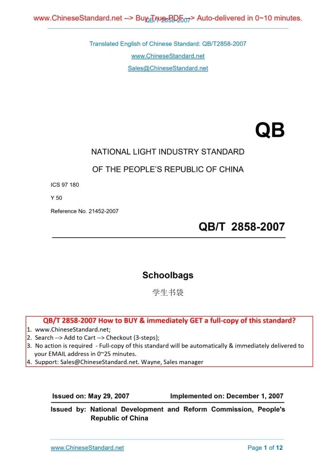 QB/T 2858-2007: Schoolbags Delivery: 9 seconds. True-PDF full-copy in English & invoice will be downloaded + auto-delivered via email. See step-by-step procedure Status: Valid