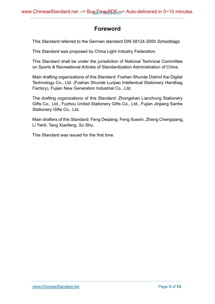 Similar standardsQB/T 2858-2007: Schoolbags---This is an excerpt. Full copy of true-PDF in English version (including equations, symbols, images, flow-chart, tables, and figures etc.), auto-downloaded/delivered in 9 seconds, can be purchased online: https://www.ChineseStandard.net/PDF.aspx/QBT2858-2007QB NATIONAL LIGHT INDUSTRY STANDARD OF THE PEOPLE’S REPUBLIC OF CHINA ICS 97 180 Y 50 Reference No. 21452-2007 Schoolbags 学生书袋 Issued on: MAY 29, 2007 Implemented on: DECEMBER 1, 2007 Issued by. National Development and Reform Commission, People's Republic of China Table of ContentsForeword ... 3 1 Scope ... 4 2 Normative references ... 4 3 Classifications ... 5 4 Requirements ... 5 5 Test methods ... 9 6 Inspection rules ... 10 7 Marks, packaging, transport, storage ... 12ForewordThis Standard referred to the German standard DIN 58124-2000 Schoolbags. This Standard was proposed by China Light Industry Federation. This Standard shall be under the jurisdiction of National Technical Committee on Sports & Recreational Articles of Standardization Administration of China. Main drafting organizations of this Standard. Foshan Shunde District Kai Digital Technology Co., Ltd. (Foshan Shunde Lunjiao Intellectual Stationery Handbag Factory), Fujian New Generation Industrial Co., Ltd. The drafting organizations of this Standard. Zhongshan Lianzhong Stationery Gifts Co., Ltd., Fuzhou United Stationery Gifts Co., Ltd., Fujian Jinjiang Sanhe Stationery Gifts Co., Ltd. Main drafters of this Standard. Feng Deqiang, Feng Xuexin, Zheng Chengqiang, Li Yanli, Tang Xiaofeng, Xu Shu. This Standard was issued for the first time. Schoolbags1 ScopeThis Standard specifies the classification, specifications, requirements, test methods, inspection rules and marks, packaging, transport, storage of schoolbags. This Standard is applicable to shoulder bags, backpacks and handbags mainly used to place teaching textbooks, supplementary materials and student supplies. Other bags with similar functions can refer to this Standard for the implementation.2 Normative referencesThe following standards contain the provisions which, through reference in this Standard, constitute the provisions of this Standard. For dated references, subsequent amendments (excluding corrections) or revisions do not apply to this Standard. However, the parties who enter into agreement based on this Standard are encouraged to investigate whether the latest versions of these documents are applicable. For undated reference documents, the latest versions apply to this Standard. GB/T 2828.1-2003, Sampling procedures for inspection by attributea-Part1. Sampling schemes indexed by acceptance quality limit (AQL) for lot-by-lot inspection GB/T 2829-2002, Sampling procedures and tables for periodic inspection by attributes (Apply to inspection of process stability) GB/T 2912.1-1998, Textiles--Determination of formaldehyde--Part 1. Free and hydrolized formaldehyde (Water extraction method) GB/T 3920-1997, Textiles - Tests for colour fastness--Colour fastness to rubbing GB 6675-2003, National safety technical code for toys QB/T 3826-1999, Corrosion-resistant testing method of the metal deposits and conversion coatings for the light industrial products--Neutral salt spraying test (NSS) QB/T 3832-1999, Evaluation of the corrosion test results of the metal5 Test methods5.1 Specification Use a steel ruler of which the scale value is 1 mm to measure. 5.2 Weight-bearing 5.2.1 Swing test The schoolbags shall bear weight according to the provisions. It shall respectively test the straps and handles. hang in suspension and the straps shall be in the longest state; OR adjust the distance to the swing axis as 50 cm ~ 60 cm. Swing 30 times (a round trip is regarded as 1 time). Swing angle is (60 ± 3)°. When swing stops, inspect whether the straps, handles, adjustment belts, hooks and loops are firm. Within 2 mm, measure the lengths of parts as connection role. Compared with the original length, check if the deformation exceeds 20%. 5.2.2 Static, falling tests Measure the lengths of parts as connection role. The bag shall bear the weight 1.2 times the specified weight. Hang in suspension (the straps are in the longest state). The height from the bag bottom to the ground (the ground surface is hardwood board) is 60 cm. Make the force even and in static state. After 30 min, make it fall vertically. Inspect whether the straps, handles, adjustment belt, hooks and loops are firm. Within 2 mm, measure the lengths of parts as connection role. Compared with the original length, check if the deformation exceeds 20%. 5.3 Tests of other performances 5.3.1 Suture strength Take two pieces of suture fabric from the main part of the schoolbag of which the area of each piece is 60 mm × 60 mm. The upper and lower fixture width is 50 mm, depth is (30 ± 2) mm. Use tension machine to test at a tension speed of (100 ± 10) mm/min till it breaks (thread or fabric). Take the maximum value as the test result. The the reading on the tension machine exceeds the specified suture strength value but the sample is not broken, it shall suspend the test. 5.3.2 Electroplating accessories Carry out the test according to QB/T 3826-1999. Evaluate the test results according to QB/T 3832-1999. 5.3.3 Zipper durable fastness7 Marks, packaging, transport, storage7.1 Marks 7.1.1 The product’s name, manufacturer (or distributor) name, address, trademark, standard reference used, production date or lot number should be marked on the product (or packaging). 7.1.2 The schoolbag mark (label) should be marked with specifications, material, if necessary, there should be washing instructions and instructions on use. 7.2 Packaging The inside and outside of the product should be packed in plastic or paper, and the certificate should be placed. The outside packaging is carton. 7.3 Transport During transport, pay attention to the use of cover tools to prevent the sun, rain. 7.4 Storage Store in a dry and ventilate