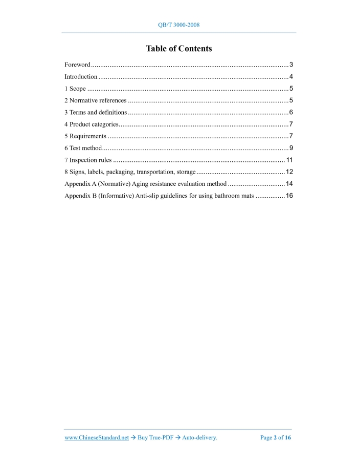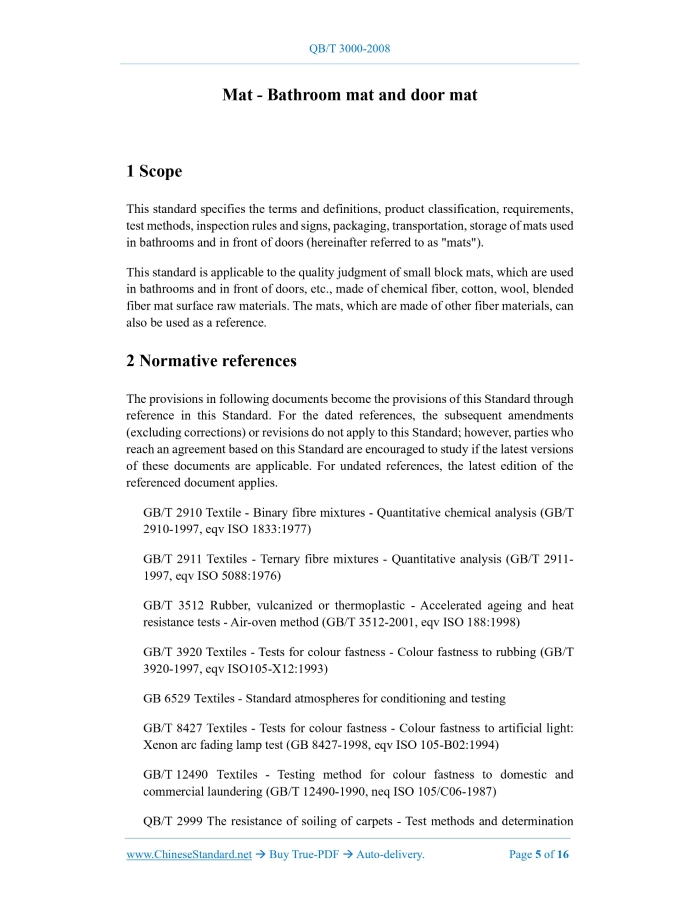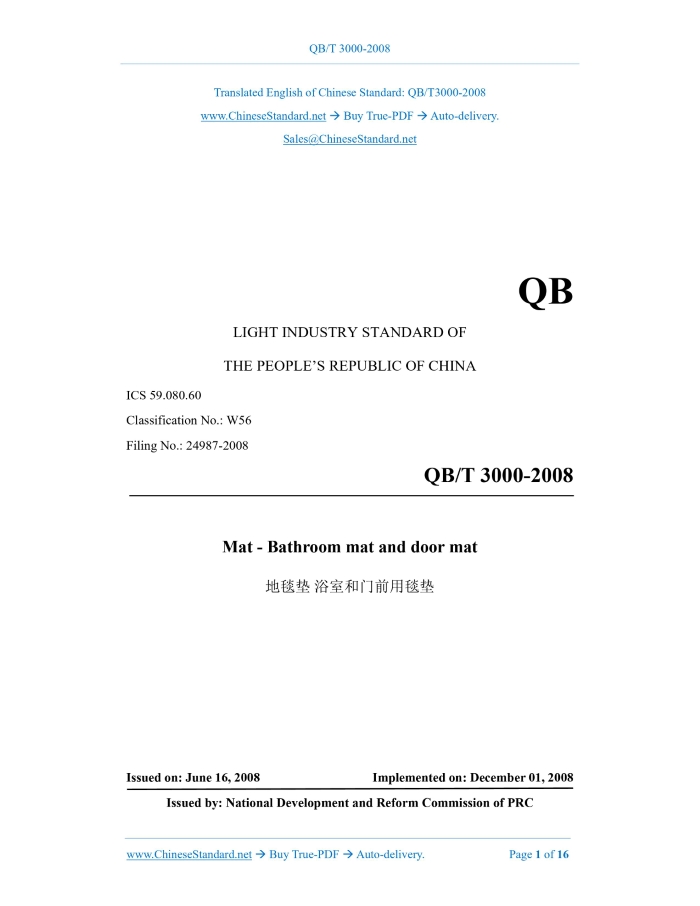 QB/T 3000-2008: Mat - Bathroom mat and door mat Delivery: 9 seconds. True-PDF full-copy in English & invoice will be downloaded + auto-delivered via email. See step-by-step procedure Status: Valid
