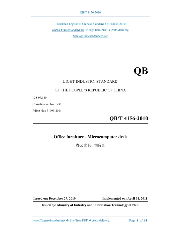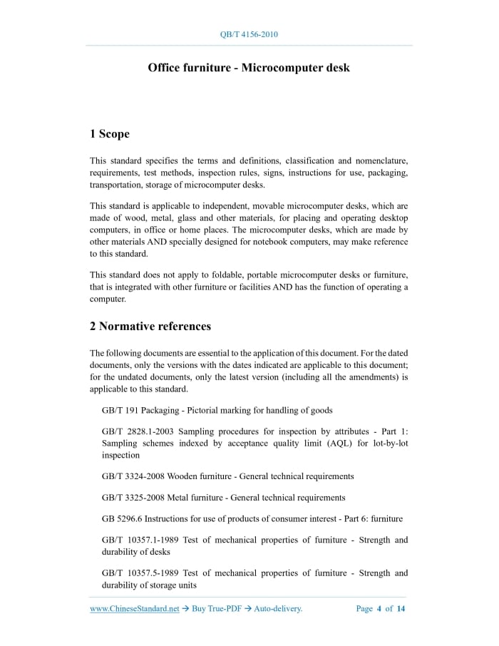 Similar standardsQB/T 4156-2010: Office furniture - Microcomputer desk---This is an excerpt. Full copy of true-PDF in English version (including equations, symbols, images, flow-chart, tables, and figures etc.), auto-downloaded/delivered in 9 seconds, can be purchased online: https://www.ChineseStandard.net/PDF.aspx/QBT4156-2010QB LIGHT INDUSTRY STANDARD OF THE PEOPLE’S REPUBLIC OF CHINA ICS 97.140 Classification No.: Y81 Filing No.: 31099-2011 Office furniture - Microcomputer desk ISSUED ON: DECEMBER 29, 2010 IMPLEMENTED ON: APRIL 01, 2011 Issued by: Ministry of Industry and Information Technology of PRC Table of ContentsForeword ... 3 1 Scope ... 4 2 Normative references ... 4 3 Terms and definitions ... 5 4 Classification and naming ... 5 5 Requirements ... 6 6 Test methods ... 10 7 Inspection rules ... 11 8 Marking, instruction for use, packaging, transportation, storage ... 13 Office furniture - Microcomputer desk1 ScopeThis standard specifies the terms and definitions, classification and nomenclature, requirements, test methods, inspection rules, signs, instructions for use, packaging, transportation, storage of microcomputer desks. This standard is applicable to independent, movable microcomputer desks, which are made of wood, metal, glass and other materials, for placing and operating desktop computers, in office or home places. The microcomputer desks, which are made by other materials AND specially designed for notebook computers, may make reference to this standard. This standard does not apply to foldable, portable microcomputer desks or furniture, that is integrated with other furniture or facilities AND has the function of operating a computer.2 Normative referencesThe following documents are essential to the application of this document. For the dated documents, only the versions with the dates indicated are applicable to this document; for the undated documents, only the latest version (including all the amendments) is applicable to this standard. GB/T 191 Packaging - Pictorial marking for handling of goods GB/T 2828.1-2003 Sampling procedures for inspection by attributes - Part 1: Sampling schemes indexed by acceptance quality limit (AQL) for lot-by-lot inspection GB/T 3324-2008 Wooden furniture - General technical requirements GB/T 3325-2008 Metal furniture - General technical requirements GB 5296.6 Instructions for use of products of consumer interest - Part 6: furniture GB/T 10357.1-1989 Test of mechanical properties of furniture - Strength and durability of desks GB/T 10357.5-1989 Test of mechanical properties of furniture - Strength and durability of storage units GB/T 10357.7-1995 Test of mechanical properties of furniture - Stability of desks GB 18584 Indoor decorating and refurbishing materials-limit of harmful substances of wood based furniture3 Terms and definitionsThe terms and definitions, which are defined in GB/T 3324 and GB/T 3325, as well as the following terms and definitions, apply to this document. 3.1 Keyboard bracket A horizontal push-pull movable part, which is installed under the desktop, for placing and operating the keyboard. 3.2 Microcomputer support plate A stand-alone component, which is used for placing the microcomputer AND whose base can be equipped with casters. 3.3 Printer bracket A component, which is installed above the desktop, has fixed or position-adjustable stand, for placing printer.4 Classification and naming4.1 Classification by material a) Wooden microcomputer desk: The main component's material is wood or artificial wood material; b) Metal microcomputer desk: The main component's material is metal material; c) Steel-wood microcomputer desk: The main component's materials are wood or artificial wood materials and metal materials. Mixed material microcomputer desk: The desktop, shelf or bracket is made of glass or other materials; the main frame parts are made of wood, metal or steel wood. 4.2 Classification by desktop height adjustment function 6.2 Determination of shape and position tolerances It is carried out, according to the provisions of GB/T 3324-2008 or GB/T 3325-2008. 6.3 Visual inspection It is carried out, according to the provisions of GB/T 3324-2008 or GB/T 3325-2008. 6.4 Structural inspection Adopt manual and visual inspections. 6.5 Test of physical-chemical properties 6.5.1 Determination of wood moisture content It is carried out, according to the provisions of GB/T 3324-2008. 6.5.2 Test of surface physical-chemical properties It is carried out, according to GB/T 3324-2008 or GB/T 3325-2008, as well as the provisions of Table 4. 6.6 Mechanical properties test It is carried out, according to the provisions in Table 5. 6.7 Determination of limits of hazardous substances It is carried out, according to the provisions of GB 18584.7 Inspection rules7.1 Inspection classification Inspection is divided into exit-factory inspection and type inspection. 7.2 Exit-factory inspection 7.2.1 Exit-factory inspection items The exit-factory inspection items are 5.1 ~ 5.4 and 5.5.1.1 in Chapter 5. 7.2.2 Sampling and group-batching rules The exit-factory inspection shall be for all products. Due to the large batch size, if it is difficult to carry out the 100% inspection, the sampling inspection can be carried out. The sampling inspection method is based on the provisions of GB/T 2828.1-2003, using b) After the official production, if there are major changes in structure, material, process, which may affect the performance of the product; c) During normal production, an inspection shall be carried out periodically or after accumulating a certain amount of output; the inspection period is generally one year; d) When the production is resumed, after long-term suspension; e) When there is a big difference between the exit-factory inspection result and the last type inspection; f) When the national quality supervision agency puts forward the requirements for type inspection. 7.3.3 Sampling rules In an inspection cycle, 2 samples are ra