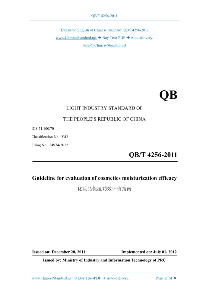 QB/T 4256-2011: Guideline for evaluation of cosmetics moisturization efficacy Delivery: 9 seconds. True-PDF full-copy in English & invoice will be downloaded + auto-delivered via email. See step-by-step procedure Status: Valid