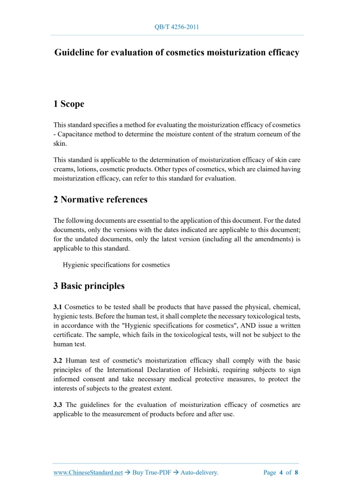 QB/T 4256-2011: Guideline for evaluation of cosmetics moisturization efficacy---This is an excerpt. Full copy of true-PDF in English version (including equations, symbols, images, flow-chart, tables, and figures etc.), auto-downloaded/delivered in 9 seconds, can be purchased online: https://www.ChineseStandard.net/PDF.aspx/QBT4256-2011LIGHT INDUSTRY STANDARD OF THE PEOPLE’S REPUBLIC OF CHINA ICS 71.100.70 Classification No.. Y42 Filing No.. 34974-2012 Guideline for evaluation of cosmetics moisturization efficacy Issued on. DECEMBER 20, 2011 Implemented on. JULY 01, 2012 Issued by. Ministry of Industry and Information Technology of PRC Table of ContentsForeword... 3 1 Scope... 4 2 Normative references... 4 3 Basic principles... 4 4 Principles... 5 5 Test conditions and volunteer requirements... 5 6 Reagents and materials... 5 7 Instruments... 6 8 Measurement steps... 6 9 Result calculation... 7 10 Result judgment... 7 11 Test report... 7ForewordThis standard was proposed by China National Light Industry Federation. This standard shall be under the jurisdiction of the National Standardization Technical Committee of Flavor, Flavor and Cosmetics (SAC/TC 257). The main drafting organizations of this standard. Beijing Technology and Business University, China Academy of Inspection and Quarantine, Chinese People's Liberation Army Air Force General Hospital, Shanghai Jahwa United Co., Ltd., L'Oreal (China) Co., Ltd., Unilever (China) Co., Ltd., Amway (China) Daily Necessities Co., Ltd., Shanghai Daily Chemical Industry Research. The main drafters of this standard. Su Ning, Wang Changtao, Dong Yinmao, Liu Juan, Wang Chao, Zhao Hua, Liu Wei. Guideline for evaluation of cosmetics moisturization efficacy1 ScopeThis standard specifies a method for evaluating the moisturization efficacy of cosmetics - Capacitance method to determine the moisture content of the stratum corneum of the skin. This standard is applicable to the determination of moisturization efficacy of skin care creams, lotions, cosmetic products. Other types of cosmetics, which are claimed having moisturization efficacy, can refer to this standard for evaluation.2 Normative referencesThe following documents are essential to the application of this document. For the dated documents, only the versions with the dates indicated are applicable to this document; for the undated documents, only the latest version (including all the amendments) is applicable to this standard. Hygienic specifications for cosmetics3 Basic principles3.1 Cosmetics to be tested shall be products that have passed the physical, chemical, hygienic tests. Before the human test, it shall complete the necessary toxicological tests, in accordance with the "Hygienic specifications for cosmetics", AND issue a written certificate. The sample, which fails in the toxicological tests, will not be subject to the human test. 3.3 The guidelines for the evaluation of moisturization efficacy of cosmetics are applicable to the measurement of products before and after use.4 PrinciplesUsing the capacitance method to measure the moisture content of the human skin's stratum corneum, is based on the principle that, the dielectric constants of water and other substances are significantly different.5 Test conditions and volunteer requirements5.1 Environmental conditions for test Test environment's temperature. 20 °C ~ 22 °C; humidity. 40% ~ 60%; perform real- time dynamic monitoring. 5.2 Number of volunteers Effective volunteers 24 ~ 30 people. 5.3 Volunteer conditions 5.3.1 Age between 18 ~ 65 years old (except pregnant or lactating women). 5.3.4 Those who have no active allergic diseases. 5.3.5 Those who have no serious allergic constitution. 5.3.6 Those who have not taken hormone drugs and immunosuppressants, in the past one month. 5.3.7 Those who have not participated in other clinical tests, at the test site at present or in the last three months.6 Reagents and materials6.1 Dry face tissue. 6.3 Syringes or pipettes.7 Instruments7.1 Capacitance method skin moisture meter, such as Corneometer or equivalent.8 Measurement steps8.1 Preparation before the test It shall not use any products (cosmetics or external medicines), at the test site, 2 ~ 3 days before the test; it shall not be in contact with water, for 1 ~ 3 hours. Before the test, subjects need to clean their hands and forearms uniformly. The cleaning method is to wipe it clean, by dry facial tissue. 8.2 Determination The product's coating area and blank control area shall be randomly distributed, around the left and right arm's marking area, to ensure that the locations of all products and blank areas are statistically balanced.9 Result calculationDescriptive statistics are performed on the measured values of each test area, including quantity, mean, standard deviation, minimum, median, maximum values, etc.10 Result judgmentPositive result. Before and after the use of the product, if there is a significant difference in the moisture content of the stratum corneum in the test area, it indicates that the test sample has a moisturization efficacy.11 Test reportThe test report shall include. QB/T 4256-2011 LIGHT INDUSTRY STANDARD OF THE PEOPLE’S REPUBLIC OF CHINA ICS 71.100.70 Classification No.. Y42 Filing No.. 34974-2012 Guideline for evaluation of cosmetics moisturization efficacy Issued on. DECEMBER 20, 2011 Implemented on. JULY 01, 2012 Issued by. Ministry of Industry and Information Technology of PRCTable of ContentsForeword... 3 1 Scope... 4 2 Normative references... 4 3 Basic principles... 4 4 Principles... 5 5 Test conditions and volunteer requirements... 5 6 Reagents and materials... 5 7 Instruments... 6 8 Measurement steps... 6 9 Result calculation... 7 10 Result judgment... 7 11 Test report... 7ForewordThis standard was proposed by China National Light Industry Federation. This standard shall be under the jurisdiction of the National Standardization Technical Committee of Flavor, Flavor and Cosmetics (SAC/TC 257). The