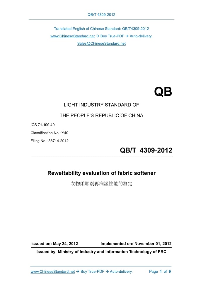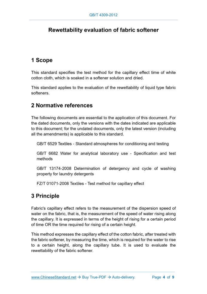 QB/T 4309-2012: Rewettability evaluation of fabrics softener Delivery: 9 seconds. True-PDF full-copy in English & invoice will be downloaded + auto-delivered via email. See step-by-step procedure Status: Obsolete QB/T 4309: Historical versions