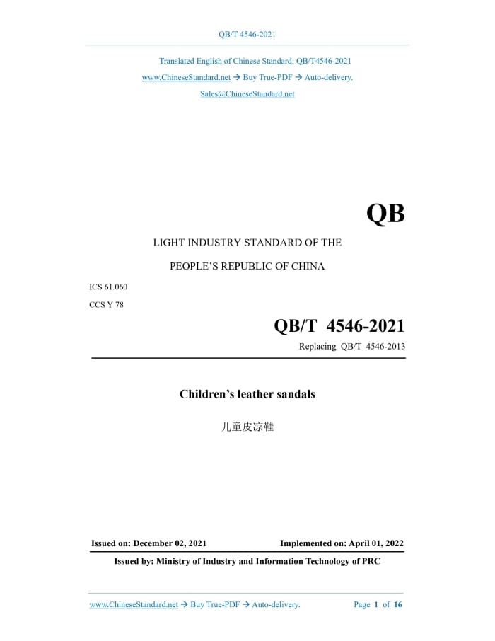 QB/T 4546-2021: Children leather sandals Delivery: 9 seconds. True-PDF full-copy in English & invoice will be downloaded + auto-delivered via email. See step-by-step procedure Status: Valid QB/T 4546: Historical versions