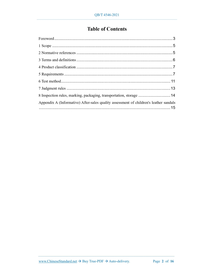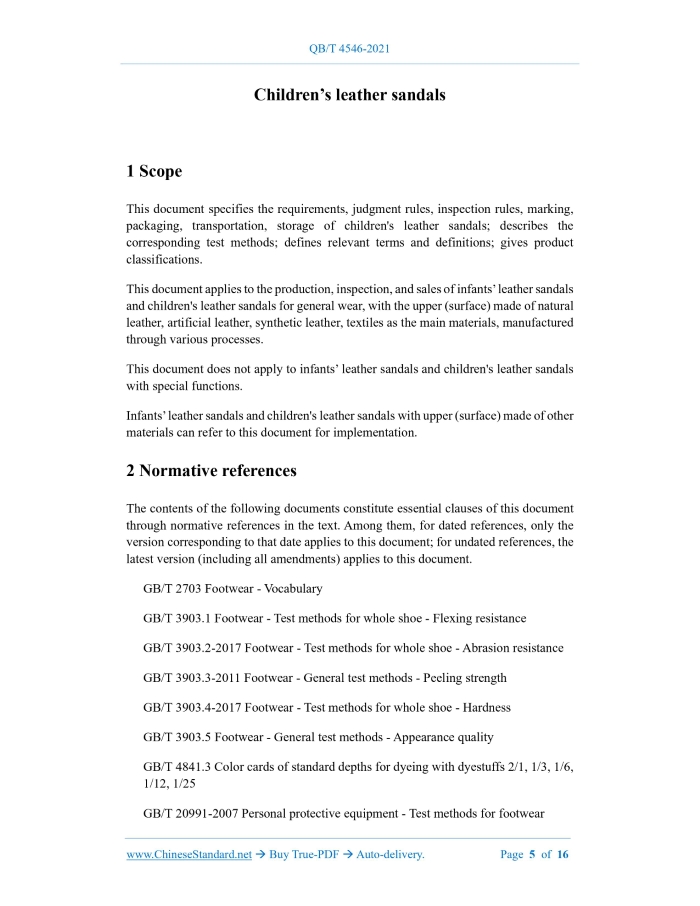 Similar standardsQB/T 4546-2021: Children leather sandals---This is an excerpt. Full copy of true-PDF in English version (including equations, symbols, images, flow-chart, tables, and figures etc.), auto-downloaded/delivered in 9 seconds, can be purchased online: https://www.ChineseStandard.net/PDF.aspx/QBT4546-2021QB LIGHT INDUSTRY STANDARD OF THE PEOPLE’S REPUBLIC OF CHINA ICS 61.060 CCS Y 78 Replacing QB/T 4546-2013 Children’s leather sandals 儿童皮凉鞋 ISSUED ON: DECEMBER 02, 2021 IMPLEMENTED ON: APRIL 01, 2022 Issued by: Ministry of Industry and Information Technology of PRC Table of ContentsForeword ... 3 1 Scope ... 5 2 Normative references ... 5 3 Terms and definitions ... 6 4 Product classification ... 7 5 Requirements ... 7 6 Test method ... 11 7 Judgment rules ... 13 8 Inspection rules, marking, packaging, transportation, storage ... 14 Appendix A (Informative) After-sales quality assessment of children's leather sandals ... 15 Children’s leather sandals1 ScopeThis document specifies the requirements, judgment rules, inspection rules, marking, packaging, transportation, storage of children's leather sandals; describes the corresponding test methods; defines relevant terms and definitions; gives product classifications. This document applies to the production, inspection, and sales of infants’ leather sandals and children's leather sandals for general wear, with the upper (surface) made of natural leather, artificial leather, synthetic leather, textiles as the main materials, manufactured through various processes. This document does not apply to infants’ leather sandals and children's leather sandals with special functions. Infants’ leather sandals and children's leather sandals with upper (surface) made of other materials can refer to this document for implementation.2 Normative referencesThe contents of the following documents constitute essential clauses of this document through normative references in the text. Among them, for dated references, only the version corresponding to that date applies to this document; for undated references, the latest version (including all amendments) applies to this document. GB/T 2703 Footwear - Vocabulary GB/T 3903.1 Footwear - Test methods for whole shoe - Flexing resistance GB/T 3903.2-2017 Footwear - Test methods for whole shoe - Abrasion resistance GB/T 3903.3-2011 Footwear - General test methods - Peeling strength GB/T 3903.4-2017 Footwear - Test methods for whole shoe - Hardness GB/T 3903.5 Footwear - General test methods - Appearance quality GB/T 4841.3 Color cards of standard depths for dyeing with dyestuffs 2/1, 1/3, 1/6, 1/12, 1/25 GB/T 20991-2007 Personal protective equipment - Test methods for footwear GB/T 21396-2008 Footwear - Test methods for whole shoe - Upper sole adhesion GB/T 28011 Shanks for footwear GB/T 38011 Footwear - Test methods for whole shoe - Pull-out force of upper bands HG/T 3689-2014 Test method of discoloration for footwear QB/T 1187 Footwear - Principle of inspection and marking, package, transportation, storage QB/T 1472 Flexing index of fiberous board for footwear QB/T 2673 Labeling for footwear product QB/T 2882-2007 Footwear - Test methods for uppers, linings and insoles - Color fastness to rubbing and bleeding QB/T 4862 Midsoles for footwear3 Terms and definitionsThe terms and definitions as defined in GB/T 2703, as well as the following terms and definitions, apply to this document. 3.1 Infants' leather sandals Leather sandals with shoe size not exceeding 170, generally suitable for infants and young children aged 3 years and below. 3.2 Children's leather sandals Leather sandals with shoe size greater than 170, generally suitable for children aged 3 to 14. 3.3 Closed sandals The upper surface is basically complete, without large areas of perforation, and is mostly made of hollow, narrow leather strips and woven materials to meet the requirements of coolness and breathability. 3.4 Open sandals One or two of the upper parts of the front tip, inner and outer waist, and heel are incomplete, and the upper surface forms a large perforation. Note: The open sandals can be front opening, rear opening, middle opening, front closed rear opening, front and rear closed whilst middle opening, etc. 3.5 Stripe sandals The upper surface is made of strips of various widths through sewing or knitting. Note: The stripe sandals are more exposed than the open sandals; they are divided into various specific forms, such as front straps and back straps according to the position of the straps.4 Product classification4.1 According to the upper material, it can be divided into natural leather (top leather, split leather), artificial leather, synthetic leather, textiles, mixed materials and other uppers for infants’ leather sandals and children's leather sandals. 4.2 According to the upper structure, it can be divided into closed leather sandals and children's leather sandals, open leather sandals and children's leather sandals, stripe leather sandals and children's leather sandals. 4.3 According to the user, it can be divided into children's leather sandals and infants’ leather sandals.5 Requirements5.1 General requirements 5.1.1 Product identification shall meet the requirements of QB/T 2673. 5.1.2 After-sales quality judgment is shown in Appendix A. 5.2 Sensory quality Sensory quality requirements are shown in Table 1. Items 1 ~ 5 are the primary items; items 6 ~ 9 are the subsidiary items. d) Other cases that are not suitable for testing the upper and sole peeling strength. 5.3.3.3 The upper and sole peeling strength shall not be less than 40 N/cm. 5.3.3.4 If the material is torn and the peeling layer is not opened during the upper and sole peeling strength test, the peeling strength shall not be less than 30 N/cm. 5.3.4 Outsole hardness 5.3.4.1 The hardness of the solid outsole shall be 45 Shore A ~ 65 Shore A. The hardness of the microporous foam outsole shall be 45 Shore C ~ 65 Shore C. The composite 