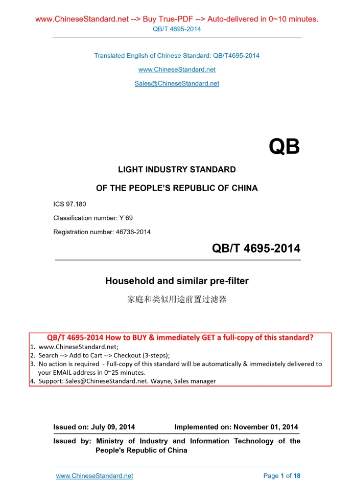 QB/T 4695-2014: Household and similar Pre-filter Delivery: 9 seconds. True-PDF full-copy in English & invoice will be downloaded + auto-delivered via email. See step-by-step procedure Status: Valid