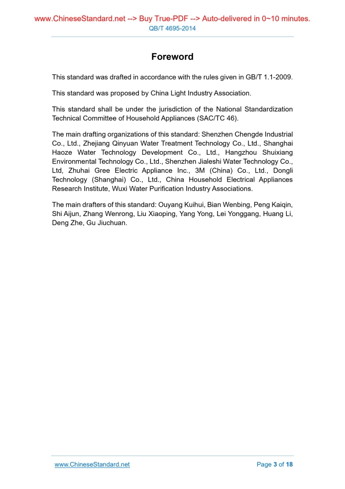 Similar standardsQB/T 4695-2014: Household and similar Pre-filter---This is an excerpt. Full copy of true-PDF in English version (including equations, symbols, images, flow-chart, tables, and figures etc.), auto-downloaded/delivered in 9 seconds, can be purchased online: https://www.ChineseStandard.net/PDF.aspx/QBT4695-2014QB LIGHT INDUSTRY STANDARD OF THE PEOPLE’S REPUBLIC OF CHINA ICS 97.180 Classification number. Y 69 Registration number. 46736-2014 Household and similar pre-filter Issued on: JULY 09, 2014 Implemented on: NOVEMBER 01, 2014 Issued by. Ministry of Industry and Information Technology of the People's Republic of China Table of ContentsForeword ... 3 1 Scope ... 4 2 Normative references ... 4 3 Terms and definitions ... 5 4 Product classification and model designation ... 6 5 Requirements ... 7 6 Test methods ... 9 7 Inspection rules ... 15 8 Marking, packaging, transportation and storage ... 17ForewordThis standard was drafted in accordance with the rules given in GB/T 1.1-2009. This standard was proposed by China Light Industry Association. This standard shall be under the jurisdiction of the National Standardization Technical Committee of Household Appliances (SAC/TC 46). The main drafting organizations of this standard. Shenzhen Chengde Industrial Co., Ltd., Zhejiang Qinyuan Water Treatment Technology Co., Ltd., Shanghai Haoze Water Technology Development Co., Ltd., Hangzhou Shuixiang Environmental Technology Co., Ltd., Shenzhen Jialeshi Water Technology Co., Ltd, Zhuhai Gree Electric Appliance Inc., 3M (China) Co., Ltd., Dongli Technology (Shanghai) Co., Ltd., China Household Electrical Appliances Research Institute, Wuxi Water Purification Industry Associations. The main drafters of this standard. Ouyang Kuihui, Bian Wenbing, Peng Kaiqin, Shi Aijun, Zhang Wenrong, Liu Xiaoping, Yang Yong, Lei Yonggang, Huang Li, Deng Zhe, Gu Jiuchuan. Household and similar pre-filter1 ScopeThis standard specifies the terms and definitions, product classifications and model designations, requirements, test methods, inspection rules, marking, packaging, transport and storage of household and similar filtration equipment for the removal of particulate matter in tap water. This standard applies to the pre-filter which uses the municipal tap water or other centralized supplied water as raw water AND the filter or lamination as the main filtration means, used for household and similar applications.2 Normative referencesThe following documents are essential to the application of this document. For the dated documents, only the versions with the dates indicated are applicable to this document; for the undated documents, only the latest version (including all the amendments) are applicable to this Standard. GB/T 191-2008 Packaging – Pictorial marking for handling of goods (ISO 780.1997, MOD) GB/T 1019 General requirements for the package of household and similar electrical appliances GB/T 2828.1 Sampling procedures for inspection by attributes - Part 1. Sampling scheme indexed by acceptance quality limit (AQL) for lot-by-lot inspection (GB/T 2828.1-2012, ISO 2859-1.1999, IDT) GB/T 2829 Sampling procedures and tables for periodic inspection by attributes (Apply to inspection of stability for productive process) GB/T 4706.1 Safety of household and similar electrical appliances - Part 1. General requirements (GB 4706.1-2005, IEC 60335-1.2001, IDT) GB 5749 Sanitary standard for drinking water GB/T 10125 Corrosion tests in artificial atmospheres - Salt spray test (GB/T 10125-2012, ISO 9227.2006, IDT) GB/T 17219 Standard for safety evaluation of equipment and protective materials It refers to the efficiency of the pre-filter to be able to retain the particles of the nominal pore size of the manufacturer. Note. Unit is %. 3.6 Pressure drop It refers to, when the pre-filter works, the difference between the water inlet pressure and the purified water outlet pressure. Note. The unit is kilopascal (kPa). 3.7 Rated water flow It refers to, under the working pressure of 0.2 MPa, the amount of water produced per unit time. Note 1. The unit is liters per hour (L/h). Note 2. During the operation, it may conduct such flux recovery operation as flush and backflush in accordance with the methods as specified by the manufacturer. 3.8 Rated production capacity It refers to the total amount of water filtered when the flushing cannot make the flux recover or cannot make it reach to the expected filtration accuracy after the filter element is used for a certain period. Note. The unit is cubic meters (m3).4 Product classification and model designation4.1 Product classification Depending on the specifications, the pre-filters are divided into the following categories. - Filter element type. 5.1.2 Environmental conditions a) Temperature. 4 °C ~ 40 °C; b) Avoid direct sunlight; c) Relative humidity. not more than 90% (at 25 °C). 5.2 Appearance Appearance shall be clean and neat and free from rust or burr. 5.3 Structure 5.3.1 CONDUCT static pressure test, AND the pre-filter shall have no leakage or permanent deformation. 5.3.2 In the water purification or backflush state, CONDUCT the cycle pressure test, AND the pre-filter shall have no leakage or permanent deformation. 5.3.3 CONDUCT the burst pressure test, AND the pre-filter shall have no leakage or permanent deformation. The pre-filter equipped with plastic barrel shall be able to withstand the static pressure 4 times of the maximum working pressure OR 2.76 MPa (whichever is larger). 5.4 Use performance 5.4.1 Purified water flow The actual purified water flow shall not be less than the rated water flow. 5.4. 2 Retention rate Retention rate shall not be less than 90%. 5.4.3 Pressure drop At the rated working flow, the working pressure drop of the totally new pre-filter shall not exceed 50 kPa. The water flow shall not be less than the provisions in Table 1. Table 1 Corresponding relationship between water flow and nominal size Nominal size DN15 DN20 DN25 DN32 D
