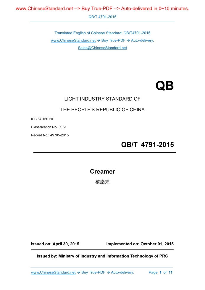 QB/T 4791-2015: Creamer Delivery: 9 seconds. True-PDF full-copy in English & invoice will be downloaded + auto-delivered via email. See step-by-step procedure Status: Valid