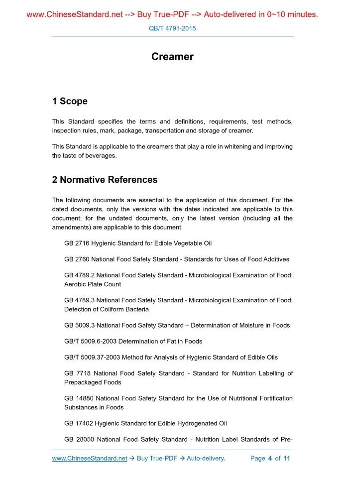 QB/T 4791-2015: Creamer---This is an excerpt. Full copy of true-PDF in English version (including equations, symbols, images, flow-chart, tables, and figures etc.), auto-downloaded/delivered in 9 seconds, can be purchased online: https://www.ChineseStandard.net/PDF.aspx/QBT4791-2015LIGHT INDUSTRY STANDARD OF THE PEOPLE’S REPUBLIC OF CHINA ICS 67.160.20 Classification No.: X 51 Record No.: 49705-2015 Creamer 植脂末 ISSUED ON: APRIL 30, 2015 IMPLEMENTED ON: OCTOBER 01, 2015 Issued by: Ministry of Industry and Information Technology of PRC Table of ContentsForeword ... 3 1 Scope ... 4 2 Normative References ... 4 3 Terms and Definitions ... 5 4 Requirements ... 5 5 Test Methods ... 6 6 Inspection Rules ... 8 7 Mark, Package, Transportation and Storage ... 9 Appendix A (Normative) Determination of Surface Oil-Fat-Content ... 10ForewordThis Standard was drafted as per the rules specified in GB/T 1.1-2009. This Standard was proposed by China Light Industry Council. This Standard shall be under the jurisdiction of National Technical Committee for Standardization of Beverage (SAC/TC 472). Drafting organizations of this Standard: Technical Working Committee of China Beverage Industry Association; Beijing Beida Mingde Technology Development Co., Ltd.; Suzhou Jiahe Foods Industry Co., Ltd.; Wuxi Super Food Technology Co., Ltd.; Nestle (China) Ltd.; Hubei Xiangyuan Food Co., Ltd.; Fujian Jumbo Grand Food Co., Ltd.; Shandong Dashu Biological Engineering Technology Co., Ltd.; and Jiangxi Weierbao Food Biology Co., Ltd. Chief drafting staffs of this Standard: Wang Qi, Kang Xiaobin, Zhang Dongbai, Liu Xinrong, Xiong Wenke, Jia Xiaolu, Li Sheng, Shen Fupeng, Xue Bing, and Xie Chuanhua. Creamer1 ScopeThis Standard specifies the terms and definitions, requirements, test methods, inspection rules, mark, package, transportation and storage of creamer. This Standard is applicable to the creamers that play a role in whitening and improving the taste of beverages.2 Normative ReferencesThe following documents are essential to the application of this document. For the dated documents, only the versions with the dates indicated are applicable to this document; for the undated documents, only the latest version (including all the amendments) are applicable to this document. GB 2716 Hygienic Standard for Edible Vegetable Oil GB 2760 National Food Safety Standard - Standards for Uses of Food Additives GB 4789.2 National Food Safety Standard - Microbiological Examination of Food: Aerobic Plate Count GB 4789.3 National Food Safety Standard - Microbiological Examination of Food: Detection of Coliform Bacteria GB 5009.3 National Food Safety Standard – Determination of Moisture in Foods GB/T 5009.6-2003 Determination of Fat in Foods GB/T 5009.37-2003 Method for Analysis of Hygienic Standard of Edible Oils GB 7718 National Food Safety Standard - Standard for Nutrition Labelling of Prepackaged Foods GB 14880 National Food Safety Standard for the Use of Nutritional Fortification Substances in Foods GB 17402 Hygienic Standard for Edible Hydrogenated Oil GB 28050 National Food Safety Standard - Nutrition Label Standards of Pre- packaged Food3 Terms and DefinitionsFor the purpose of this document, the following terms and definitions apply. 3.1 Creamer The powdery or granular products taking sugar (including edible sugar or starch sugar) and/or syrup, edible oil and fat as the main raw materials; adding or not adding milk or dairy product, the like food ingredients and food additives; made by spraying, drying and other process technologies for whitening and improving the taste of beverage. 3.2 Scorch particles The dark yellow to black substance, formed by heating and carbonizing during the production of creamer, after screening, still mixed in the creamer.4 Requirements4.1 Ingredients 4.1.1 The edible vegetable oil shall conform to the provisions of GB 2716. 4.1.2 The edible hydrogenated oil shall conform to the provisions of GB 17402. 4.1.3 Other ingredients shall conform to the provisions of corresponding national and industry standards. 4.2 Sensory It shall conform to the provisions of Table 1. Table 1 – Sensory Requirements Items Requirements Color and luster White to milky white or milky yellow, or have the color and luster corresponding to the adding ingredients Taste and odor Have the taste and odor conforming to the ingredients, and odorless Structure state Powdery or particle state, loose, no block, no foreign matters 4.3 Physical chemical indicator It shall conform to the provisions of Table 2. Table 2 – Physical and Chemical Indicator Items Requirements Fat / (g/100g) ≥ 3.0 Proportion of surface oil-fat content in the fat / % ≤ 5.0 Peroxide value / (g/100g) ≤ 0.25 Moisture / (g/100g) ≤ 5.0 Scorch particles / (piece/100g) ≤ 5 4.4 Food safety 4.4.1 Food additive and food nutritive fortifier It shall conform to the provisions of GB 2760 and GB 14880. 4.4.2 Aerobic plate count and coliform bacteria It shall conform to the provisions of aerobic plate count and coliform bacteria specified by solid beverage. 4.4.3 Others It shall conform to the provisions of solid beverage specified in the relevant national food safety standard.5 Test Methods5.1 Sensory 5.1.1 Take 10g of sample onto the clean white vessel; place it in the bright position; observe its structure state, color and luster. 5.1.2 Take 5g~10g of sample; use 100mL of 80°C distilled water to dissolve; smell its odor, and taste it. 5.2 Physical and chemical indicator 5.2.1 Fat It shall be measured as per the “Method-II Acid Hydrolysis” specified in GB/T 5009.6- 2003. 5.2.2 Proportion of surface oil-fat-content in fat 5.2.2.1 The surface oil-fat-content shall be measured as per the method specified in Appendix A. 5.2.2.2 The proportion of surface oil-fat-content in fat shall be calculated as per the Formula (1): Y = × 100% …………………………………… (1) Where: Y – proportion of surface oil-fat-content in fat, in %; X – sur