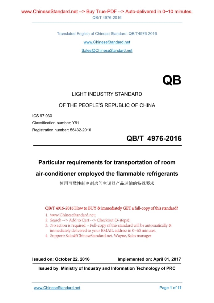 QB/T 4976-2016: Particular requirements for transportation of room air-conditioner employed the flammable refrigerants Delivery: 9 seconds. True-PDF full-copy in English & invoice will be downloaded + auto-delivered via email. See step-by-step procedure Status: Valid