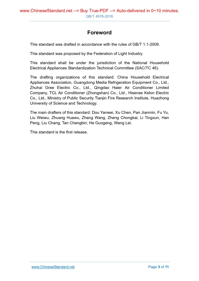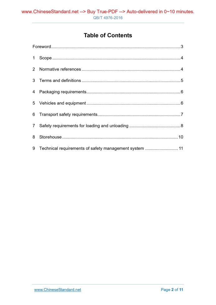 Similar standardsQB/T 4976-2016: Particular requirements for transportation of room air-conditioner employed the flammable refrigerants---This is an excerpt. Full copy of true-PDF in English version (including equations, symbols, images, flow-chart, tables, and figures etc.), auto-downloaded/delivered in 9 seconds, can be purchased online: https://www.ChineseStandard.net/PDF.aspx/QBT4976-2016 QB LIGHT INDUSTRY STANDARD ICS 97.030 Classification number. Y61 Registration number. 56432-2016 Particular requirements for transportation of room air-conditioner employed the flammable refrigerants Issued on. OCTOBER 22, 2016 Implemented on. APRIL 01, 2017 Issued by. Ministry of Industry and Information Technology of PRC Table of ContentsForeword... 3 1 Scope... 4 2 Normative references... 4 3 Terms and definitions... 5 4 Packaging requirements... 6 5 Vehicles and equipment... 6 6 Transport safety requirements... 7 7 Safety requirements for loading and unloading... 8 8 Storehouse... 10 9 Technical requirements of safety management system... 11ForewordThis standard was drafted in accordance with the rules of GB/T 1.1-2009. This standard was proposed by the Federation of Light Industry. This standard shall be under the jurisdiction of the National Household Electrical Appliances Standardization Technical Committee (SAC/TC 46). The drafting organizations of this standard. China Household Electrical Appliances Association, Guangdong Media Refrigeration Equipment Co., Ltd., Zhuhai Gree Electric Co., Ltd., Qingdao Haier Air Conditioner Limited Company, TCL Air Conditioner (Zhongshan) Co., Ltd., Hisense Kelon Electric Co., Ltd., Ministry of Public Security Tianjin Fire Research Institute, Huazhong University of Science and Technology. The main drafters of this standard. Dou Yanwei, Xu Chen, Pan Jianmin, Fu Yu, Liu Weiwu, Zhuang Huawu, Zhang Wang, Zheng Chongkai, Li Tingxun, Han Peng, Liu Chang, Tan Chengbin, He Guogeng, Wang Lei. This standard is the first release. Particular requirements for transportation of room air-conditioner employed the flammable refrigerants1 ScopeThis standard specifies the safety requirements related to the land transportation of room air-conditioner employed the flammable refrigerants (hereinafter shortly referred to as air conditioner) after exit-factory. This standard applies to the room air-conditioner products as defined in GB/T 7725. The mobile air-conditioners as defined in GB/T 22257 AND the dehumidifier as defined in GB/T 19411 may make reference to this standard.2 Normative referencesThe following documents are essential to the application of this document. For the dated documents, only the versions with the dates indicated are applicable to this document; for the undated documents, only the latest version (including all the amendments) are applicable to this Standard. GB 4706.32 Safety of household and similar electrical appliances - Particular requirements for heat pumps, air-conditioner and dehumidifier GB/T 7725 Room air conditioners GB/T 7778 Number designation and safety classification of refrigerants GB 13392 The vehicle mark for road transportation dangerous goods GB 18565 Composite performance requirement and detecting methods for road transport vehicles GB/T 19411 Dehumidifiers3 Terms and definitionsThe terms and definitions as defined in GB/T 7725 and GB 4706.32 AND the following terms and definitions apply to this document. 3.1 Flammable refrigerant The refrigerant classified into type A2 and A3 in accordance with GB/T 7778. 3.2 Air-conditioner transportation The logistics activities of transporting the air conditioners from one place to another, including collecting, distributing, handling, transferring, loading, unloading and distribution. 3.3 Package The general name of vessels, materials and auxiliary materials used to protect the product, facilitate transportation, and prompt sale during the circulation process in accordance with certain technical methods. AND it also refers to the operational activities of applying a certain technical method in the process of using the vessels, materials, and auxiliary materials to achieve the aforementioned purposes.4 Packaging requirements4.1 Basic requirements 4.2 Packaging materials 4.2.1 The air-conditioners and their components which had been filled with inflammable refrigerants shall use the packaging film made of anti-static material.5 Vehicles and equipment5.1 Vehicles and equipment requirements 5.1.1 Transport vehicles may use general cargo trucks, AND the technical conditions of the vehicle shall comply with the class I vehicle conditions as specified in JT/T 198. 5.1.5 The vehicles shall be configured with the signs complying with GB 13392, the side and tail shall be attached with orange white or red white reflective strip, which shall be used in accordance with provisions. 5.1.6 The vehicles shall be equipped with the necessary communication tools. 5.2 Other requirements 5.2.1 Units engaged in air conditioner transport shall have the corresponding facilities and equipment to ensure the safe transport of air conditioners. 5.2.2 It shall use the tools which will not produce sparks in loading and unloading air conditioners, it is prohibited of smoking in the carriage, AND the vehicle shall be kept away from open fire or high temperature places. The vehicle shall be installed of the grounding line, which shall be regularly checked.6 Transport safety requirements6.1 Pre-transportation requirements 6.1.1 The driver and relevant staff shall be noticed of the knowledge on transporting this type of air-conditioner product. 6.1.4 The air-conditioner shall be fixed tightly before being transported to avoid movement or friction, AND meanwhile the fixation method shall not cause the damage to the cargo or packaging box. 6.1.5 Check whether the cargo is stacked neatly, and the height shall not exceed the stacking height as specified on the package. 6.1.6 During van truck transportation or container transportation, if 
