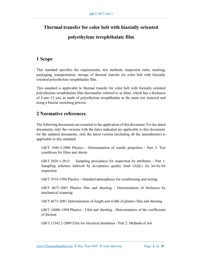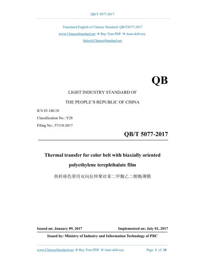 QB/T 5077-2017: Thermal transfer for color belt with biaxially oriented polyethylene terephthalate film Delivery: 9 seconds. True-PDF full-copy in English & invoice will be downloaded + auto-delivered via email. See step-by-step procedure Status: Valid