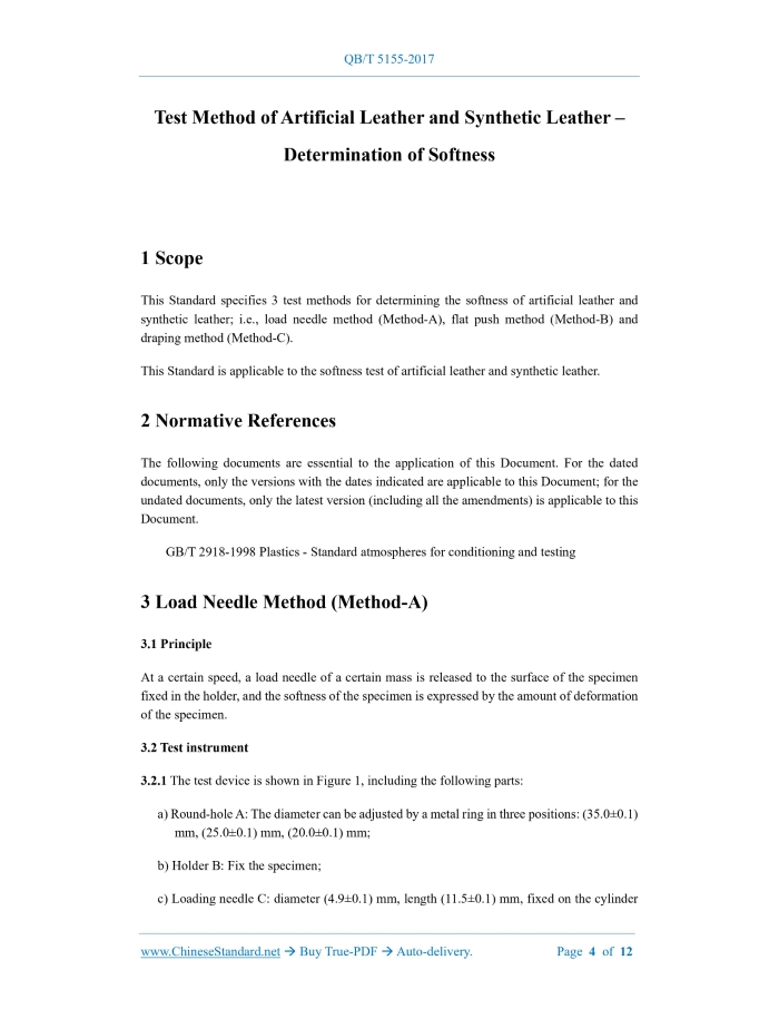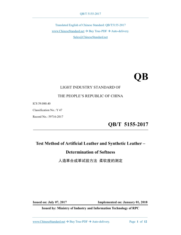 QB/T 5155-2017: Test method of artificial leather and synthetic leather - Determination of softness Delivery: 9 seconds. True-PDF full-copy in English & invoice will be downloaded + auto-delivered via email. See step-by-step procedure Status: Valid