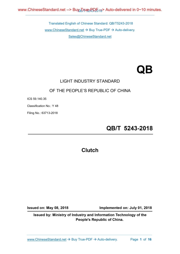 QB/T 5243-2018: Clutch Delivery: 9 seconds. True-PDF full-copy in English & invoice will be downloaded + auto-delivered via email. See step-by-step procedure Status: Valid