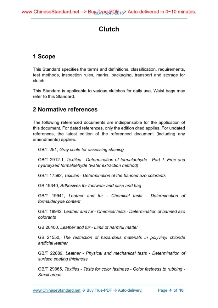 QB/T 5243-2018: Clutch---This is an excerpt. Full copy of true-PDF in English version (including equations, symbols, images, flow-chart, tables, and figures etc.), auto-downloaded/delivered in 9 seconds, can be purchased online: https://www.ChineseStandard.net/PDF.aspx/QBT5243-2018QB LIGHT INDUSTRY STANDARD OF THE PEOPLE’S REPUBLIC OF CHINA ICS 59.140.35 Classification No.. Y 48 Filing No.. 63713-2018 Clutch Issued on: MAY 08, 2018 Implemented on: JULY 01, 2018 Issued by. Ministry of Industry and Information Technology of the People's Republic of China. Table of ContentsForeword ... 3 1 Scope ... 4 2 Normative references ... 4 3 Terms and definitions ... 5 4 Classification ... 5 5 Requirements ... 6 6 Test methods ... 9 7 Inspection rules ... 10 8 Marks, packaging, transport and storage ... 11 Annex A (normative) Test method for rotating friction color fastness ... 13 Annex B (normative) Special type inspection ... 16 Clutch1 ScopeThis Standard specifies the terms and definitions, classification, requirements, test methods, inspection rules, marks, packaging, transport and storage for clutch. This Standard is applicable to various clutches for daily use. Waist bags may refer to this Standard.2 Normative referencesThe following referenced documents are indispensable for the application of this document. For dated references, only the edition cited applies. For undated references, the latest edition of the referenced document (including any amendments) applies. GB/T 251, Gray scale for assessing staining GB/T 2912.1, Textiles - Determination of formaldehyde - Part 1. Free and hydrolyzed formaldehyde (water extraction method) GB/T 17592, Textiles - Determination of the banned azo colorants GB 19340, Adhesives for footwear and case and bag GB/T 19941, Leather and fur - Chemical tests - Determination of formaldehyde content GB/T 19942, Leather and fur - Chemical tests - Determination of banned azo colorants GB 20400, Leather and fur - Limit of harmful matter GB 21550, The restriction of hazardous materials in polyvinyl chloride artificial leather GB/T 22889, Leather - Physical and mechanical tests - Determination of surface coating thickness GB/T 29865, Textiles - Tests for color fastness - Color fastness to rubbing - Small areas QB/T 1586.1, Hardware fitting of case and bag - Case - lock QB/T 2002.1, Technical Conditions of Electroplated Layer of Leather Hardware Fittings QB/T 2002.2, Technical Conditions of Surface Spray Painting of Leather Hardware Fittings QB/T 2171, Metal Zippers QB/T 2172, Injection Molding Zipper QB/T 2173, Nylon Zipper QB/T 2790, Dyeing fur - Testing method for color fastness to rubbing QB/T 3826, Corrosion-resistant testing method of the metal deposits and conversion coatings for the light industrial products - Neutral salt spraying test (NSS) QB/T 5085, Hardware fitting of case and bag. Magnetic buckle3 Terms and definitionsFor the purposes of this document, the following terms and definitions apply. 3.1 clutch bag with smaller volume (no more than 3L), hand-held, with auxiliary strap (removable or non-removable) or strap (detachable)4 Classification4.1 Classified according to top layer material. - leather clutch; - recycled leather clutch; - artificial leather/synthetic leather clutch; - fur clutch; - fabric clutch; - clutch that uses a variety of materials for the fabric; - clutch of other material. a Not applicable to special style materials. b Common types of leather with a surface coating thickness of not more than 20μm are water-dyed leather, aniline leather, semi-aniline leather, etc.6 Test methods6.1 Raw material and accessories Before inspection and production, inspect or verify according to relevant standards. The limit of harmful substances is tested according to GB/T 2912, GB/T 17592, GB 19340, GB 20400, GB 21550 and other standards. 6.2 Appearance quality In natural light, use the senses and combined with the ruler to measure. The division of ruler is 1mm. 6.3 Color fastness to friction Fabrics are inspected according to GB/T 29865. Friction head diameter is 16mm. Furs are inspected according to QB/T 2790. Leather, recycled leather, artificial leather/synthetic leather shall be inspected in accordance with Annex A. The sample to be measured for the thickness of the surface coating shall be measured according to GB/T 22889. 6.4 Accessory quality Perform manual inspection of clutch locks, connectors, hooks, broken fasteners, shelf openings, etc. One opening-closing is recorded as once. - Mechanical code lock sets the password by dialing the password wheel. And use the set password to turn the password lock on and off. Combine each digit randomly. Perform unlocking, locking 200 times, respectively. For key lock, insert the key with hand and insert it into the lock keyway to unlock and lock the lock. Electronic code lock uses an electronic key to unlock and lock the lock. - Key lock, electronic code lock. use non-dedicated key to start test 10 times. Mechanical password lock uses any 10 groups of different garbled to start the test. - Connector, hook, magnetic fastener, shelf mouth. one opening-closing is recorded as once; test 200 times separately. 6.5 Zipper durability 7.5.2 Determination rules for batch products When three testing samples all meet the requirements for qualified products, this batch of products shall be qualified. If one (and more) fails, it shall perform double sampling for re-inspection. When the re-inspection is qualified, this batch of products shall be qualified.8 Marks, packaging, transport and storage8.1 Marks 8.1.1 The products inspected qualified shall have the following marks. - (manufacturer or distributor) name, address and contact telephone; - when necessary, product’s instructions for use (maintenance); - when necessary, the outer packaging of product shall include identifications of product name, item number, quantity, storage and transport (protection). 8.1.2 Product label shall comply with the followings. - shall mar