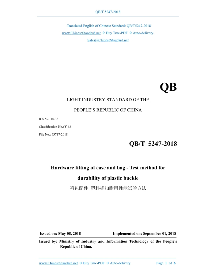 QB/T 5247-2018: Hardware fitting of case and bag - Test method for durability of plastic buckle Delivery: 9 seconds. True-PDF full-copy in English & invoice will be downloaded + auto-delivered via email. See step-by-step procedure Status: Valid