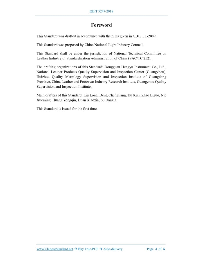 QB/T 5247-2018: Hardware fitting of case and bag - Test method for durability of plastic buckle---This is an excerpt. Full copy of true-PDF in English version (including equations, symbols, images, flow-chart, tables, and figures etc.), auto-downloaded/delivered in 9 seconds, can be purchased online: https://www.ChineseStandard.net/PDF.aspx/QBT5247-2018QB LIGHT INDUSTRY STANDARD OF THE PEOPLE’S REPUBLIC OF CHINA ICS 59.140.35 Classification No.: Y 48 File No.: 63717-2018 Hardware fitting of case and bag - Test method for durability of plastic buckle ISSUED ON: MAY 08, 2018 IMPLEMENTED ON: SEPTEMBER 01, 2018 Issued by: Ministry of Industry and Information Technology of the People's Republic of China. Table of ContentsForeword ... 3 1 Scope ... 4 2 Principle ... 4 3 Devices ... 4 4 Test methods ... 5 5 Results representation ... 5 6 Test report ... 6ForewordThis Standard was drafted in accordance with the rules given in GB/T 1.1-2009. This Standard was proposed by China National Light Industry Council. This Standard shall be under the jurisdiction of National Technical Committee on Leather Industry of Standardization Administration of China (SAC/TC 252). The drafting organizations of this Standard: Dongguan Hengyu Instrument Co., Ltd., National Leather Products Quality Supervision and Inspection Center (Guangzhou), Huizhou Quality Metrology Supervision and Inspection Institute of Guangdong Province, China Leather and Footwear Industry Research Institute, Guangzhou Quality Supervision and Inspection Institute. Main drafters of this Standard: Liu Long, Deng Chengliang, Hu Kun, Zhao Liguo, Nie Xueming, Huang Yongqin, Duan Xiaoxia, Su Danxia. This Standard is issued for the first time. Hardware fitting of case and bag - Test method for durability of plastic buckle1 ScopeThis Standard specifies the principle, devices, test methods, results representation and test report of the durability test for plastic buckle. This Standard is applicable to the test of plastic buckles for case and bag, clothing.2 PrincipleSimulate the use of the specimen. Reciprocate opening-closing to the specified number of times at a certain frequency. Check the quality of the plastic buckle.3 Devices3.1 Plastic buckle durability testing machine It shall include the components specified in 3.1.1~3.1.3. 3.1.1 The test device (see Figure 1 for the schematic diagram) consists of two sets of specimen holders on the left and right. The left specimen holder is used to secure the upper part of the buckle. It can also periodically press the positioning piece of the buckle (left and right position or upper position). The right specimen holder is used to fix the lower part of the buckle. It also makes the lower part do reciprocating forward and withdrawing motion. The left and right specimen holders cooperate with each other, so that the upper and lower parts of the buckle do horizontal reciprocating opening-closing movement, and the movement frequency is adjustable. ......Source: Above contents are excerpted from the full-copy PDF -- translated/reviewed by: www.ChineseStandard.net / Wayne Zheng et al. Tips & Frequently Asked Questions:Question 1: How long will the true-PDF of English version of QB/T 5247-2018 be delivered?Answer: The full copy PDF of English version of QB/T 5247-2018 can be downloaded in 9 seconds, and it will also be emailed to you in 9 seconds (double mechanisms to ensure the delivery reliably), with PDF-invoice.Question 2: Can I share the purchased PDF of QB/T 5247-2018_English with my colleagues?Answer: Yes. The purchased PDF of QB/T 5247-2018_English will be deemed to be sold to your employer/organization who actually paid for it, including your colleagues and your employer's intranet.Question 3: Does the price include tax/VAT?Answer: Yes. Our tax invoice, downloaded/delivered in 9 seconds, includes all tax/VAT and complies with 100+ countries' tax regulations (tax exempted in 100+ countries) -- See Avoidance of Double Taxation Agreements (DTAs): List of DTAs signed between Singapore and 100+ countriesQuestion 4: Do you accept my currency other than USD?Answer: Yes. www.ChineseStandard.us -- QB/T 5247-2018 -- Click this link and select your country/currency to pay, the exact amount in your currency will be printed on the invoice. Full PDF will also be downloaded/emailed in 9 seconds.How to buy and download a true PDF of English version of QB/T 5247-2018?A step-by-step guide to download PDF of QB/T 5247-2018_EnglishStep 1: Visit website https://www.ChineseStandard.net (Pay in USD), or https://www.ChineseStandard.us (Pay in any currencies such as Euro, KRW, JPY, AUD).Step 2: Search keyword "QB/T 5247-2018". Step 3: Click "Add to Cart". If multiple PDFs are required, repeat steps 2 and 3 to add up to 12 PDFs to cart. Step 4: Select payment option (Via payment agents Stripe or PayPal). Step 5: Customize Tax Invoice -- Fill up your email etc. Step 6: Click "Checkout". Step 7: Make payment by credit card, PayPal, Google Pay etc. After the payment is completed and in 9 seconds, you will receive 2 emails attached with the purchased PDFs and PDF-invoice, respectively. Step 8: Optional -- Go to download PDF. Step 9: Optional -- Click Open/Download PDF to download PDFs and invoice. See screenshots for above steps: Steps 1~3 Steps 4~6 Step 7 Step 8 Step 9 |
