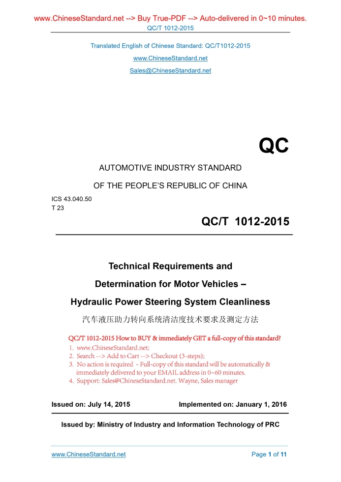 QC/T 1012-2015: Technical Requirements and Determination for Motor Vehicles - Hydraulic Power Steering System Cleanliness Delivery: 9 seconds. True-PDF full-copy in English & invoice will be downloaded + auto-delivered via email. See step-by-step procedure Status: Valid