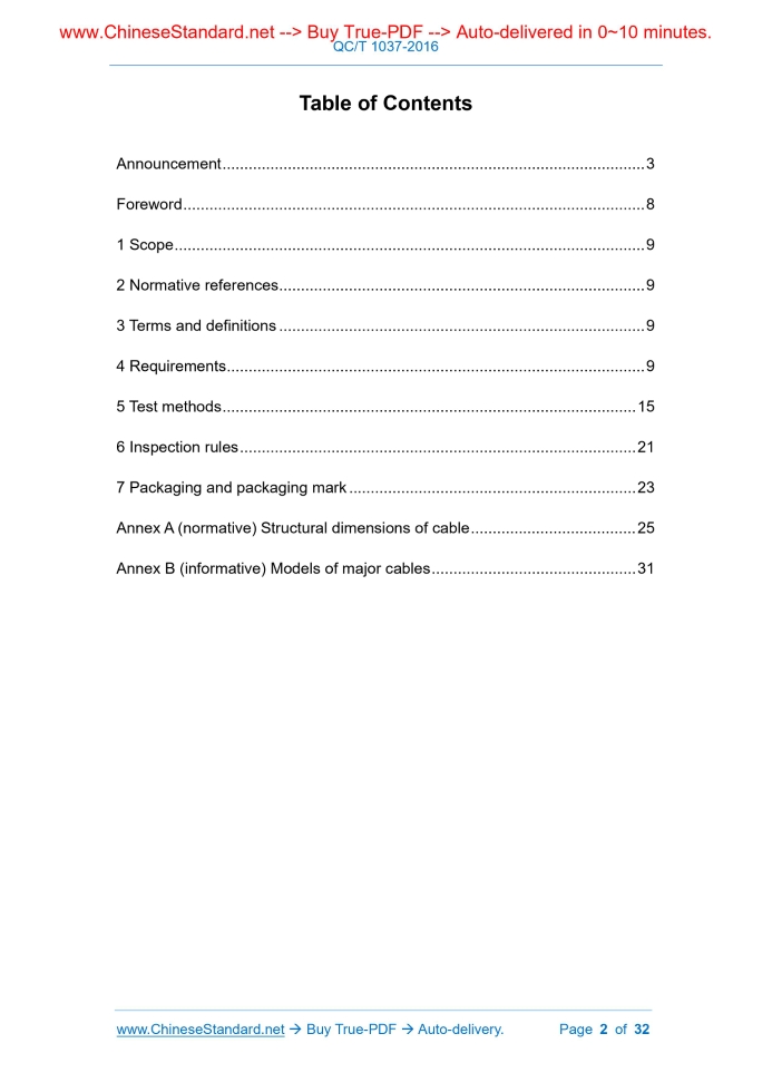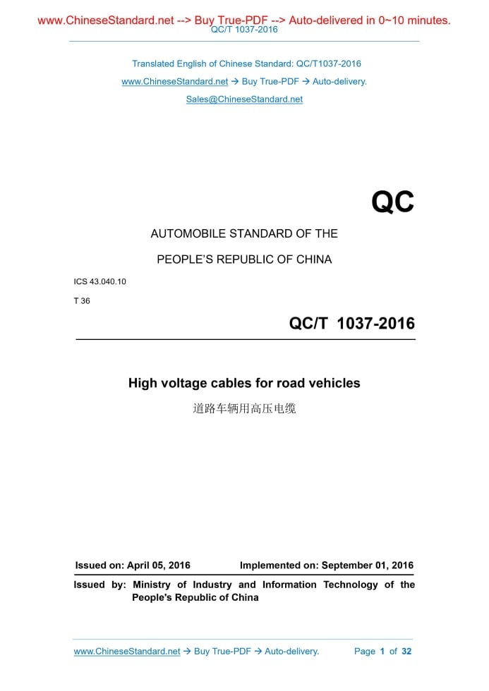 Similar standardsQC/T 1037-2016: High voltage cables for road vehicles---This is an excerpt. Full copy of true-PDF in English version (including equations, symbols, images, flow-chart, tables, and figures etc.), auto-downloaded/delivered in 9 seconds, can be purchased online: https://www.ChineseStandard.net/PDF.aspx/QCT1037-2016QC AUTOMOBILE STANDARD OF THE PEOPLE’S REPUBLIC OF CHINA ICS 43.040.10 T 36 High voltage cables for road vehicles Issued on. APRIL 05, 2016 Implemented on. SEPTEMBER 01, 2016 Issued by. Ministry of Industry and Information Technology of the People's Republic of China Table of ContentsAnnouncement... 3 Foreword... 8 1 Scope... 9 2 Normative references... 9 3 Terms and definitions... 9 4 Requirements... 9 5 Test methods... 15 6 Inspection rules... 21 7 Packaging and packaging mark... 23 Annex A (normative) Structural dimensions of cable... 25 Annex B (informative) Models of major cables... 31ForewordThis Standard was drafted in accordance with the rules given in GB/T 1.1-2009 “Directives for standardization - Part 1.Structure and drafting of standards”. This Standard does not involve patents. Annex A of this Standard is normative. Annex B is informative. This Standard was proposed by and shall be under the jurisdiction of National Technical Committee on Automobiles of Standardization Administration of China (SAC/TC 114). Main drafting organizations of this Standard. Beijing Fox Automotive Wire Co., Ltd., Changsha Automobile Electric Apparatus Research Institute, Changchun Bulb Wire Co., Ltd. Main drafters of this Standard. Huo Yan, Wang Yadong, Hu Mengwen, Li Weiyang, Zhang Jie, Wang Sengshan, Li Guoyu. High voltage cables for road vehicles1 ScopeThis Standard specifies the requirements, test methods, inspection rules, packaging and packaging marks of high voltage cables for road vehicles. This Standard is applicable to high voltage cables for road vehicles of which the rated voltages are AC 1000V/DC 1500V and AC 600V/DC 900V.2 Normative referencesThe following referenced documents are indispensable for the application of this document. For dated references, only the edition cited applies. For undated references, the latest edition of the referenced document (including any amendments) applies. GB/T 1690, Rubber vulcanized or thermoplastic - Determination of the effect of liquids GB/T 3953, Round copper wire for electrical purposes GB/T 4910, Tinned round copper wire GB/T 25085-2010, Road vehicles - 60 V and 600 V single-core cables GB/T 25087-2010, Road vehicles - Round, screened and unscreened 60 V and 600 V multi-core sheathed cables QC/T 414-2016, Color of low-voltage wire for automobile3 Terms and definitionsFor the purposes of this document, the terms and definitions defined in GB/T 25085 and GB/T 25087 apply.4 Requirements4.1 Model Cable model is compiled according to QC/T 414-2016.See Annex B for major cable models. 4.3 Structure dimensions Cable specifications and corresponding structural dimensions are given in Annex A. 4.4 Conductor 4.4.1 The conductor is twisted with bare soft round copper wire or tinned soft round copper wire as specified in Table 1. 4.5.1 The insulation layer shall be tightly coated on the conductor and easily peeled off from the conductor without damaging the conductor. 4.5.2 Agreed by both supply-demand parties, it is allowed to add spacers between the insulation layer and the conductor. 4.5.3 The insulation layer shall be inspected for defects. Breakdown discharge shall not occur during the spark test of the following voltage (effective value). - 8kV for AC 600V/DC 900V cable; - 10kV for AC 1000V/DC 1500V cable. 4.5.4 The insulation volume resistivity of the insulation layer shall not be less than 109 Ω • mm. 4.6 Stranded cable (for multi-core cable) 4.7 Shielding layer (for shielded cables) 4.7.1 The shielding layer is woven with bare copper wire or tinned copper wire as shown in Table 1.The weaving density shall be no less than 85%. 4.8 Sheathed layer (for sheathed cable) 4.8.1 The sheathed layer shall be in close contact with the core and easily peeled off from the core without damaging the insulation and shielding. 4.8.2 Allow the addition of spacers between the sheathed layer and the shield. 4.9 Surface mark 4.9.1 Cable surface shall not have obvious cracks, bubbles, impurities and bumps that exceed tolerances. 4.10 Finished cable 4.10.1 Ellipticity. Cable ellipticity shall be no more than 8%. 4.10.4 Sheathed layer water immersion withstand voltage. The sheathed layer is immersed in water 50Hz AC withstand voltage (RMS) test. The sheath of the cable shall be able to withstand 1kV for 30min, rise the voltage to 5kV, and keep it for 5min without breakdown. 4.10.7 Peeling force / adhesion. The peeling force / adhesion of the insulation / sheath of the finished cable is determined by both supply-demand parties. 4.10.8 Cyclic bending. The cable shall meet the requirements of 7.3.5 of GB/T 25087 after cyclic bending test. 4.10.11 Wear resistance. The outer layer of the cable shall be capable of withstanding the number of scratches specified in Table 4. 4.10.15 Heat shrinkage. After the finished cable has passed the heat shrinkage test. - The shrinkage of each end of the insulation shall be no more than 2mm; - The shrinkage of each end of the sheath shall be no more than 4mm. 4.10.16 Chemical resistance reagent. The cable is tested by chemical resistance reagent, and the insulation/sheath shall not be exposed/shielded after winding. Carry out the withstand voltage test without breakdown. The type of medium for chemical resistance reagent is determined by both supply-demand parties. 4.10.17 Mark durability. After the cable has been tested for durability, it shall comply with the requirements of 11.3.4 of GB/T 25085.5 Test methods5.1 General Except for the exit-factory test, all test samples shall be stored at (23 ± 5)°C for at least 16h. 5.3 Inspection of shielding weaving density Weaving density is calculated by formula (1).