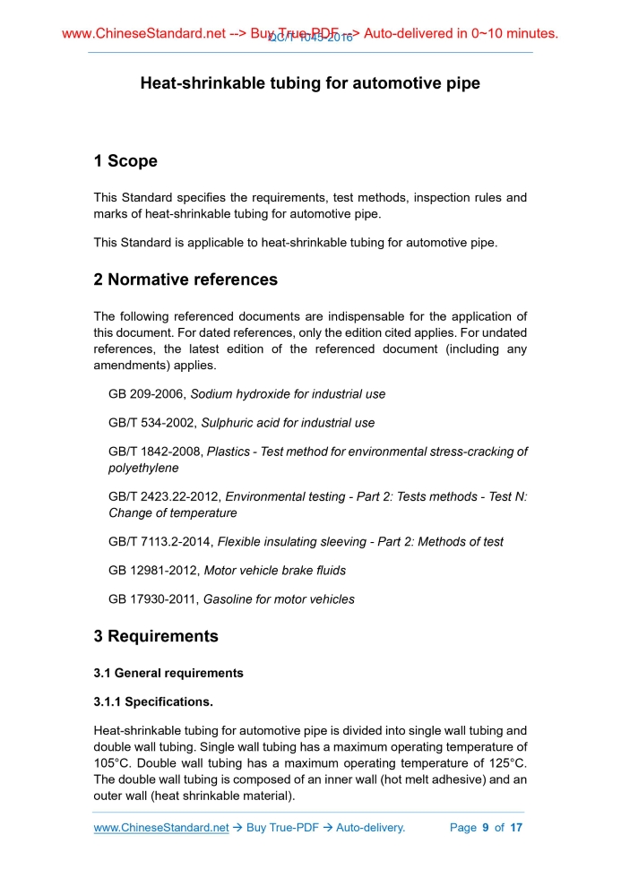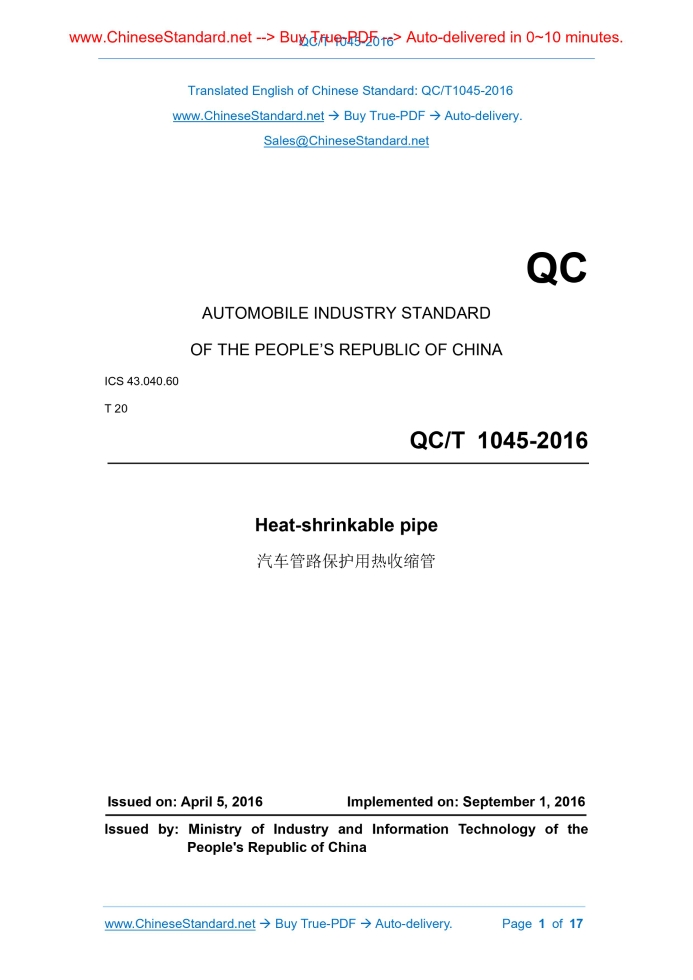 QC/T 1045-2016: Heat-shrinkable pipe Delivery: 9 seconds. True-PDF full-copy in English & invoice will be downloaded + auto-delivered via email. See step-by-step procedure Status: Valid
