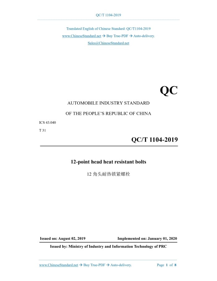 QC/T 1104-2019: 12-point head heat resistant bolts Delivery: 9 seconds. True-PDF full-copy in English & invoice will be downloaded + auto-delivered via email. See step-by-step procedure Status: Valid