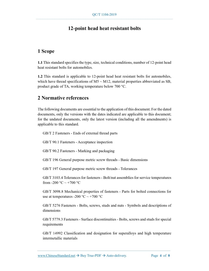 QC/T 1104-2019: 12-point head heat resistant bolts---This is an excerpt. Full copy of true-PDF in English version (including equations, symbols, images, flow-chart, tables, and figures etc.), auto-downloaded/delivered in 9 seconds, can be purchased online: https://www.ChineseStandard.net/PDF.aspx/QCT1104-2019QC AUTOMOBILE INDUSTRY STANDARD OF THE PEOPLE’S REPUBLIC OF CHINA ICS 43.040 T 31 12-point head heat resistant bolts 12角头耐热锁紧螺栓 ISSUED ON: AUGUST 02, 2019 IMPLEMENTED ON: JANUARY 01, 2020 Issued by: Ministry of Industry and Information Technology of PRC Table of ContentsForeword ... 3 1 Scope ... 4 2 Normative references ... 4 3 Type size ... 5 4 Technical requirements and reference standards ... 7 5 Product number ... 8 12-point head heat resistant bolts1 Scope1.1 This standard specifies the type, size, technical conditions, number of 12-point head heat resistant bolts for automobiles. 1.2 This standard is applicable to 12-point head heat resistant bolts for automobiles, which have thread specifications of M5 ~ M12, material properties abbreviated as SB, product grade of TA, working temperature below 700 °C.2 Normative referencesThe following documents are essential to the application of this document. For the dated documents, only the versions with the dates indicated are applicable to this document; for the undated documents, only the latest version (including all the amendments) is applicable to this standard. GB/T 2 Fasteners - Ends of external thread parts GB/T 90.1 Fasteners - Acceptance inspection GB/T 90.2 Fasteners - Marking and packaging GB/T 196 General purpose metric screw threads - Basic dimensions GB/T 197 General purpose metric screw threads - Tolerances GB/T 3103.4 Tolerances for fasteners - Bolt/nut assemblies for service temperatures from -200 °C ~ +700 °C GB/T 3098.8 Mechanical properties of fasteners - Parts for bolted connections for use at temperatures -200 °C ~ +700 °C GB/T 5276 Fasteners - Bolts, screws, studs and nuts - Symbols and descriptions of dimensions GB/T 5779.3 Fasteners - Surface discontinuities - Bolts, screws and studs for special requirements GB/T 14992 Classification and designation for superalloys and high temperature intermetallic materials ......Source: Above contents are excerpted from the full-copy PDF -- translated/reviewed by: www.ChineseStandard.net / Wayne Zheng et al. Tips & Frequently Asked Questions:Question 1: How long will the true-PDF of English version of QC/T 1104-2019 be delivered?Answer: The full copy PDF of English version of QC/T 1104-2019 can be downloaded in 9 seconds, and it will also be emailed to you in 9 seconds (double mechanisms to ensure the delivery reliably), with PDF-invoice.Question 2: Can I share the purchased PDF of QC/T 1104-2019_English with my colleagues?Answer: Yes. The purchased PDF of QC/T 1104-2019_English will be deemed to be sold to your employer/organization who actually paid for it, including your colleagues and your employer's intranet.Question 3: Does the price include tax/VAT?Answer: Yes. Our tax invoice, downloaded/delivered in 9 seconds, includes all tax/VAT and complies with 100+ countries' tax regulations (tax exempted in 100+ countries) -- See Avoidance of Double Taxation Agreements (DTAs): List of DTAs signed between Singapore and 100+ countriesQuestion 4: Do you accept my currency other than USD?Answer: Yes. www.ChineseStandard.us -- QC/T 1104-2019 -- Click this link and select your country/currency to pay, the exact amount in your currency will be printed on the invoice. Full PDF will also be downloaded/emailed in 9 seconds.How to buy and download a true PDF of English version of QC/T 1104-2019?A step-by-step guide to download PDF of QC/T 1104-2019_EnglishStep 1: Visit website https://www.ChineseStandard.net (Pay in USD), or https://www.ChineseStandard.us (Pay in any currencies such as Euro, KRW, JPY, AUD).Step 2: Search keyword "QC/T 1104-2019". Step 3: Click "Add to Cart". If multiple PDFs are required, repeat steps 2 and 3 to add up to 12 PDFs to cart. Step 4: Select payment option (Via payment agents Stripe or PayPal). Step 5: Customize Tax Invoice -- Fill up your email etc. Step 6: Click "Checkout". Step 7: Make payment by credit card, PayPal, Google Pay etc. After the payment is completed and in 9 seconds, you will receive 2 emails attached with the purchased PDFs and PDF-invoice, respectively. Step 8: Optional -- Go to download PDF. Step 9: Optional -- Click Open/Download PDF to download PDFs and invoice. See screenshots for above steps: Steps 1~3 Steps 4~6 Step 7 Step 8 Step 9 |