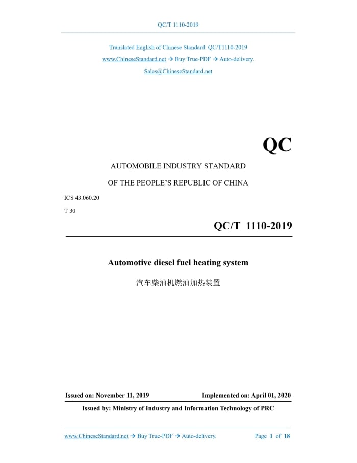 QC/T 1110-2019: Automotive diesel fuel heating system Delivery: 9 seconds. True-PDF full-copy in English & invoice will be downloaded + auto-delivered via email. See step-by-step procedure Status: Valid
