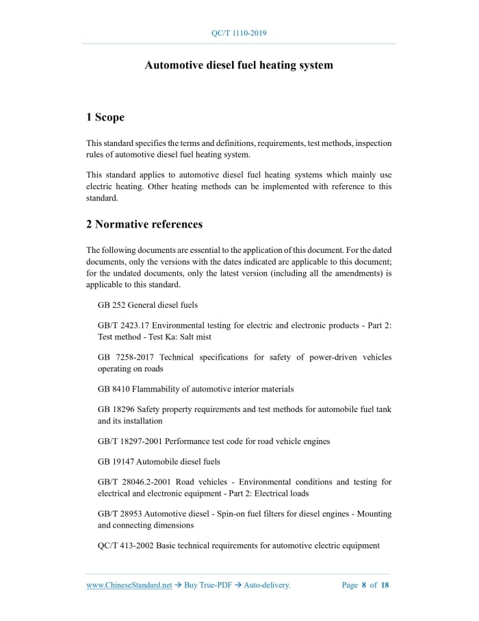 QC/T 1110-2019: Automotive diesel fuel heating system---This is an excerpt. Full copy of true-PDF in English version (including equations, symbols, images, flow-chart, tables, and figures etc.), auto-downloaded/delivered in 9 seconds, can be purchased online: https://www.ChineseStandard.net/PDF.aspx/QCT1110-2019QC AUTOMOBILE INDUSTRY STANDARD OF THE PEOPLE’S REPUBLIC OF CHINA ICS 43.060.20 T 30 Automotive diesel fuel heating system ISSUED ON: NOVEMBER 11, 2019 IMPLEMENTED ON: APRIL 01, 2020 Issued by: Ministry of Industry and Information Technology of PRC Table of ContentsForeword ... 7 1 Scope ... 8 2 Normative references ... 8 3 Terms and definitions ... 9 4 Requirements ... 9 5 Test method ... 12 6 Inspection rules ... 15 7 Signs, labels, instructions for use ... 17 8 Packaging, transport, storage ... 17 Automotive diesel fuel heating system1 ScopeThis standard specifies the terms and definitions, requirements, test methods, inspection rules of automotive diesel fuel heating system. This standard applies to automotive diesel fuel heating systems which mainly use electric heating. Other heating methods can be implemented with reference to this standard.2 Normative referencesThe following documents are essential to the application of this document. For the dated documents, only the versions with the dates indicated are applicable to this document; for the undated documents, only the latest version (including all the amendments) is applicable to this standard. GB 252 General diesel fuels GB/T 2423.17 Environmental testing for electric and electronic products - Part 2: Test method - Test Ka: Salt mist GB 7258-2017 Technical specifications for safety of power-driven vehicles operating on roads GB 8410 Flammability of automotive interior materials GB 18296 Safety property requirements and test methods for automobile fuel tank and its installation GB/T 18297-2001 Performance test code for road vehicle engines GB 19147 Automobile diesel fuels GB/T 28046.2-2001 Road vehicles - Environmental conditions and testing for electrical and electronic equipment - Part 2: Electrical loads GB/T 28953 Automotive diesel - Spin-on fuel filters for diesel engines - Mounting and connecting dimensions QC/T 413-2002 Basic technical requirements for automotive electric equipment QC/T 471 Specifications for auto diesel engines QC/T 518 Tightening torque for automotive threaded fasteners QC/T 772-2017 Test methods of diesel-fuel filter for automobiles3 Terms and definitionsThe following terms and definitions apply to this standard. 3.1 Diesel fuel heating function Under specified conditions, the efficiency of heating diesel oil to a set temperature. 3.2 Diesel fuel heating unit Components, which have diesel heating function and are capable of heating diesel as required, including but not limited to fuel tank heating unit, fuel filter heating unit, fuel pipe heating unit. 3.3 Automotive diesel fuel heating system A device, which is composed of a diesel heating unit and a temperature controller, uses on-board energy to heat the fuel, to ensure that the fuel supply system of the diesel engine normally supplies diesel (hereinafter referred to as the heating device).4 Requirements4.1 General requirements 4.1.1 The heating device shall meet the requirements of this standard AND be manufactured according to the product drawings and technical documents, which are approved by the prescribed procedures. 4.1.2 The working environment conditions of the heating device shall comply with the provisions in 3.1.2 of QC/T 413-2002. 4.1.3 The rated operating voltage of the heating device shall be 12 V (DC) or 24 V (DC). 4.1.4 The heating device shall comply with the provisions in 8.6.9 of GB 7258-2017. 4.2.5 Requirements for temperature resistance For heating devices installed on the engine, the minimum operating temperature shall not be higher than -41 °C; the maximum operating temperature shall not be lower than 120 °C. For heating devices installed in other locations, the minimum operating temperature shall not be higher than -41 °C; the maximum working temperature shall comply with the requirements in 3.1.3 of QC/T 413-2002. 4.2.6 Vibration resistance The heating device installed on the engine shall be able to pass the vibration test, which is specified in 5.9.2 of QC/T 772-2017. The heating device installed in other positions shall be able to pass the vibration test, which is specified in GB/T 18296. The heating device after the test shall comply with the provisions in 3.2 of QC/T 413-2002. 4.2.7 Requirements for salt spray resistance It shall meet the requirements in 3.13 of QC/T 413-2002. 4.2.8 Reliability requirements Under the conditions specified in 8.1 of GB/T 18297-2001, the continuous normal working time of the heating device shall not be less than 1000 h. 4.2.9 Safety requirements 4.2.9.1 The heating device shall comply with the provisions on flame retardancy in 8.6.2 of GB 7258-2017. 4.2.9.2 When heating is controlled manually, the temperature of the heated diesel oil is not allowed to exceed 45 °C; when the temperature of the diesel oil exceeds 45 °C, it shall be turned off (stop heating). When heating is automatically controlled, the temperature of the heated diesel oil shall not exceed 38 °C (set as required, not allowed to exceed 45 °C). 4.2.10 Overvoltage resistance of power supply It shall meet the provisions of 4.3 in GB/T 28046.2. 4.2.11 Resistance to reverse polarity of power supply It shall meet the requirements of 3.7.1 in QC/T 413-2002. 4.3 Installation requirements 4.3.1 Heating device When installing the heating device, the connection shall be firm and reliable; it shall be easy to disassemble, maintain, and service. There shall be no interference with other parts. The tightening torque of threaded fasteners shall comply with the provisions of QC/T 518. The heating device shall have no adverse effect on the fuel supply to the engine. 4.3.2 Fuel tank The fuel tank, which is equipped with diesel h