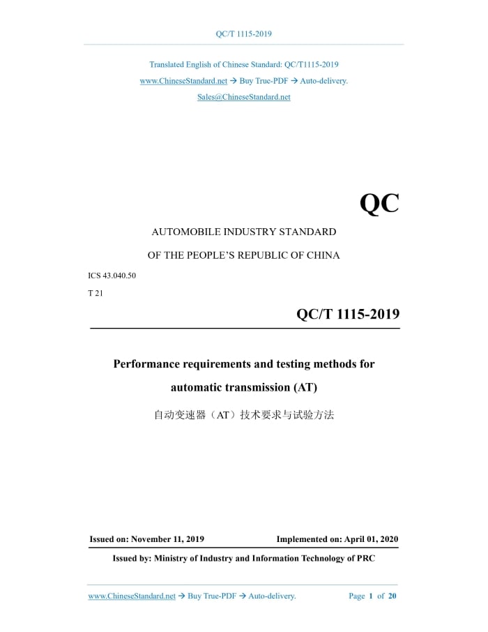QC/T 1115-2019: Performance requirements and testing methods for automatic transmission(AT) Delivery: 9 seconds. True-PDF full-copy in English & invoice will be downloaded + auto-delivered via email. See step-by-step procedure Status: Valid