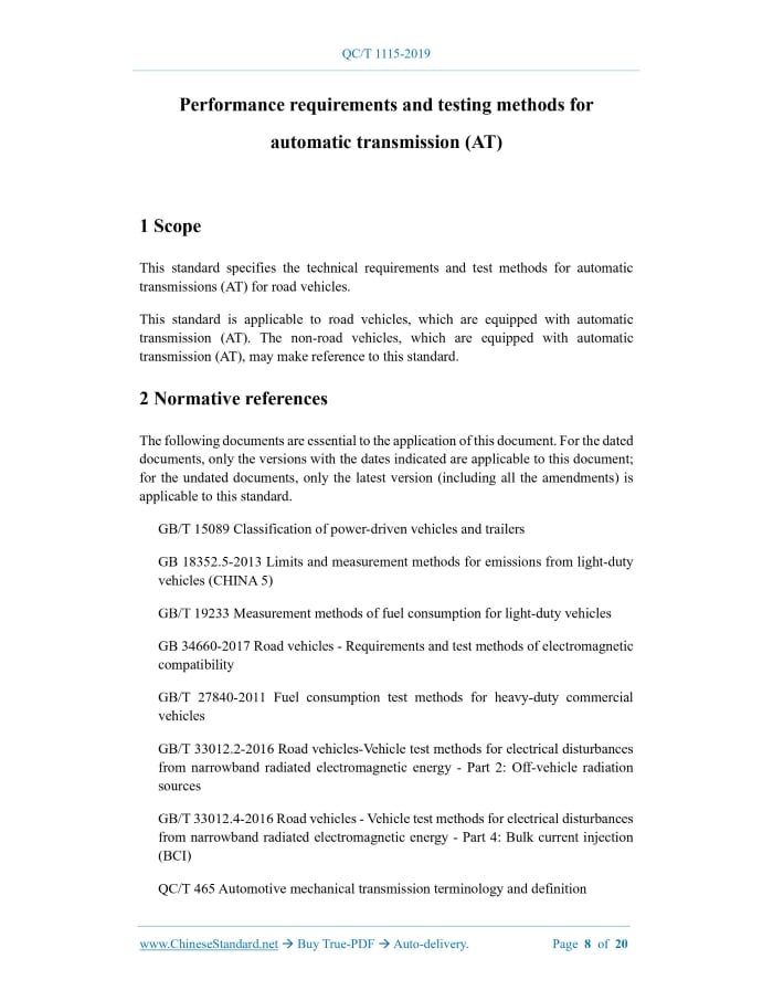 QC/T 1115-2019: Performance requirements and testing methods for automatic transmission(AT)---This is an excerpt. Full copy of true-PDF in English version (including equations, symbols, images, flow-chart, tables, and figures etc.), auto-downloaded/delivered in 9 seconds, can be purchased online: https://www.ChineseStandard.net/PDF.aspx/QCT1115-2019QC AUTOMOBILE INDUSTRY STANDARD OF THE PEOPLE’S REPUBLIC OF CHINA ICS 43.040.50 T 21 Performance requirements and testing methods for automatic transmission (AT) ISSUED ON: NOVEMBER 11, 2019 IMPLEMENTED ON: APRIL 01, 2020 Issued by: Ministry of Industry and Information Technology of PRC Table of ContentsForeword ... 7 1 Scope ... 8 2 Normative references ... 8 3 Terms and definitions ... 9 4 Test requirements and performance requirements ... 10 5 Test method ... 13 Performance requirements and testing methods for automatic transmission (AT)1 ScopeThis standard specifies the technical requirements and test methods for automatic transmissions (AT) for road vehicles. This standard is applicable to road vehicles, which are equipped with automatic transmission (AT). The non-road vehicles, which are equipped with automatic transmission (AT), may make reference to this standard.2 Normative referencesThe following documents are essential to the application of this document. For the dated documents, only the versions with the dates indicated are applicable to this document; for the undated documents, only the latest version (including all the amendments) is applicable to this standard. GB/T 15089 Classification of power-driven vehicles and trailers GB 18352.5-2013 Limits and measurement methods for emissions from light-duty vehicles (CHINA 5) GB/T 19233 Measurement methods of fuel consumption for light-duty vehicles GB 34660-2017 Road vehicles - Requirements and test methods of electromagnetic compatibility GB/T 27840-2011 Fuel consumption test methods for heavy-duty commercial vehicles GB/T 33012.2-2016 Road vehicles-Vehicle test methods for electrical disturbances from narrowband radiated electromagnetic energy - Part 2: Off-vehicle radiation sources GB/T 33012.4-2016 Road vehicles - Vehicle test methods for electrical disturbances from narrowband radiated electromagnetic energy - Part 4: Bulk current injection (BCI) QC/T 465 Automotive mechanical transmission terminology and definition4 Test requirements and performance requirements4.1 Test requirements 4.1.1 Test conditions 4.1.1.1 Environment During the test, the temperature in the test room shall be 288 K ~ 308 K (15 °C ~ 35 °C), the relative humidity shall be between 20% ~ 60%. 4.1.1.2 Transmission oil The transmission oil, which is specified by the transmission manufacturer, shall be used; the oil quantity shall be adjusted in the manner which is specified by the manufacturer. 4.1.1.3 Bench test run-in Before carrying out the measurement test of transmission torque capacity and steady- state efficiency, the test samples shall be subject to running in, according to the following specifications: a) The transmission input speed is set at 1000 r/min ~ 2000 r/min; the torque is set at 50% of the transmission rated torque. b) Run-in for 1 h in each gear. 4.1.1.4 Bench test warm-up Before the bench test, the test sample must be warmed up, until the following conditions are met at the same time: a) The transmission oil's temperature reaches 80 °C ± 5 °C. b) The speed and torque of the motor are in a stable state. 4.1.1.5 Vehicle test run-in and warm-up According to the vehicle model, the running-in and warm-up for the whole vehicle test shall be carried out, in accordance with the methods specified in Appendix C of GB 18352.5-2013 or 5.4 of GB/T 27840-2011. 4.1.2 Test equipment 4.1.2.1 Accuracy of bench test equipment 4.1.2.1.1 The error of the speed measuring device shall not exceed ±5 r/min. Carry out the torque capacity test of the transmission, according to the test method specified in 5.1. The test result shall be within the allowable range of the manufacturer's design. 4.2.2 Transmission efficiency Carry out the transmission efficiency test of the transmission, according to the test method specified in 5.2; the transmission efficiency of each gear shall not be lower than 60%. 4.2.3 Parking For the transmission, which is equipped with the P gear, the parking performance test shall be carried out, according to the test method specified in 5.3. Continue to park for 5 minutes on the up and down slope, at a gradient of 20%. It shall always keep the vehicle at a standstill. 4.2.4 Air tightness Carry out the air tightness test on the transmission, according to the test method specified in 5.4; the pressure drop shall not exceed 5 kPa. 4.2.5 Ratchet engagement For the transmission, which is equipped with the P gear, the ratchet engagement test shall be carried out, according to the test method specified in 5.5. The ratchet engagement speed must not exceed 6 km/h. 4.2.6 Neutral gear output torque For the transmission matched with the categories M3 and N3 vehicles without P gear, the neutral gear output torque test shall be carried out, according to the test method specified in 5.6. The neutral gear output torque shall not exceed 60 Nꞏm. 4.2.7 Drag torque Carry out the drag torque test, according to the test method specified in 5.7. The maximum value of the drag torque shall not exceed 7% of the rated torque or 60 Nꞏm, whichever is smaller. 4.2.8 Noise Carry out the noise test, according to the test method specified in 5.8. See Table 2, for the limit requirements of measurement results. 5.1.1.1.4 The joints shall be effectively sealed, without oil leakage. 5.1.1.2 Run-in The transmission assembly under test shall be run-in, according to the requirements of 4.1.1.3. 5.1.2 Test procedure 5.1.2.1 The load motor is set to speed control mode. 5.1.2.2 The drive motor is set to torque control mode. 5.1.2.3 The transmission is in the D gear. 5.1.2.4 The hydraulic torque converter is locked up. 5.1.2.5 