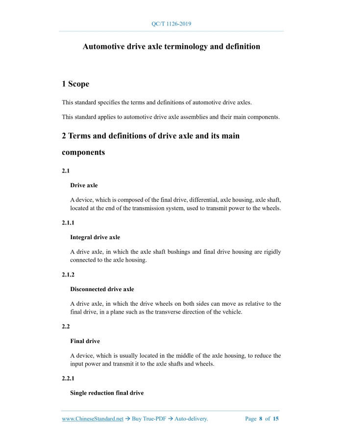 QC/T 1126-2019: Automotive drive axle terminology and definition---This is an excerpt. Full copy of true-PDF in English version (including equations, symbols, images, flow-chart, tables, and figures etc.), auto-downloaded/delivered in 9 seconds, can be purchased online: https://www.ChineseStandard.net/PDF.aspx/QCT1126-2019QC AUTOMOTIVE INDUSTRY STANDARD OF THE PEOPLE’S REPUBLIC OF CHINA ICS 43.040.50 T 21 Automotive drive axle terminology and definition ISSUED ON: NOVEMBER 11, 2019 IMPLEMENTED ON: APRIL 01, 2020 Issued by: Ministry of Industry and Information Technology of PRC. Table of ContentsForeword ... 7 1 Scope ... 8 2 Terms and definitions of drive axle and its main components ... 8 3 Terms and definitions of main technical parameters of drive axle ... 13 Automotive drive axle terminology and definition1 ScopeThis standard specifies the terms and definitions of automotive drive axles. This standard applies to automotive drive axle assemblies and their main components.2 Terms and definitions of drive axle and its maincomponents 2.1 Drive axle A device, which is composed of the final drive, differential, axle housing, axle shaft, located at the end of the transmission system, used to transmit power to the wheels. 2.1.1 Integral drive axle A drive axle, in which the axle shaft bushings and final drive housing are rigidly connected to the axle housing. 2.1.2 Disconnected drive axle A drive axle, in which the drive wheels on both sides can move as relative to the final drive, in a plane such as the transverse direction of the vehicle. 2.2 Final drive A device, which is usually located in the middle of the axle housing, to reduce the input power and transmit it to the axle shafts and wheels. 2.2.1 Single reduction final drive A final drive, which has only one pair of gear pairs for speed reduction. 2.2.2 Double reduction final drive A final drive, which has two pairs of gear pairs for speed reduction. 2.2.3 Thru-drive A final drive, that can transmit power to other final drivers, along the front or rear direction of the vehicle. 2.2.3.1 Single reduction thru-drive A thru-drive, which is composed of a pair of bevel gear pairs. 2.2.3.2 Double reduction thru-drive A thru-drive, which is composed of two pairs of gear pairs. 2.2.4 Two speed final drive A final drive, which has two reduction ratios and a set of shifting devices. 2.3 Hub reduction gear A mechanism, which is arranged at the wheel end, to reduce the speed and torque transmitted by the final drive AND then transfer it to the wheel. 2.3.1 Planetary hub reduction gear A hub reduction gear, which is composed of a planetary cylindrical gear mechanism. 2.3.2 Differential geared wheel reductor 2.4.3 Inter-wheel differential A differential, that acts as a differential between the wheels of the drive axle. 2.4.4 Inter-axle differential A differential, that acts as a differential between the drive axles. 2.5 Axle housing A component, which is equipped with final drive, axle shaft and other parts, can also support the gravity load of the vehicle mass, transmit various forces on the wheels to the components of the vehicle frame or body, through the suspension system. 2.5.1 Banjo axle housing An axle housing, which is manufactured separately from the final drive housing and bolted together. 2.5.1.1 Cast rigid axle housing Axle housing, whose body is casted. 2.5.1.2 Punching-welded axle housing Axle housing, whose body is a welded part after stamping the plate. 2.5.1.3 Bulge-forming axle housing Axle housing, whose body is formed by expanding the steel tube. 2.5.2 Trumpet-type axle housing Axle housing, which is cast integrally with the final drive housing AND bolted at the joints of two or more castings to form an integral axle housing. 2.5.3 Unitized carrier-type axle housing Axle housing, which is cast integrally with the final drive housing AND fixed by pressing both ends into the axle tube. 2.6 Axle shaft A shaft, that transmits the torque from the differential or final reducer to the wheel or hub reduction gear’s driving gear (some also bear bending moments). 2.6.1 Full-floating axle shaft An axle shaft, that transmits only torque. 2.6.2 Semi-floating axle shaft An axle shaft, that transmits torque and bears bending moments.3 Terms and definitions of main technical parameters ofdrive axle 3.1 Drive axle maximum input torque A torque, which is transmitted to the input end of the final drive, as calculated based on the maximum net output torque of the power source, the lowest gear of the transmission, the low gear reduction ratio of the transfer case (excluding transmission efficiency). 3.2 Slip torque The torque, when the drive wheel slips, which is the product of the rated axle load of the drive axle, the maximum adhesion coefficient, the rolling radius of the wheel. ......Source: Above contents are excerpted from the full-copy PDF -- translated/reviewed by: www.ChineseStandard.net / Wayne Zheng et al. Tips & Frequently Asked Questions:Question 1: How long will the true-PDF of English version of QC/T 1126-2019 be delivered?Answer: The full copy PDF of English version of QC/T 1126-2019 can be downloaded in 9 seconds, and it will also be emailed to you in 9 seconds (double mechanisms to ensure the delivery reliably), with PDF-invoice.Question 2: Can I share the purchased PDF of QC/T 1126-2019_English with my colleagues?Answer: Yes. The purchased PDF of QC/T 1126-2019_English will be deemed to be sold to your employer/organization who actually paid for it, including your colleagues and your employer's intranet.Question 3: Does the price include tax/VAT?Answer: Yes. Our tax invoice, downloaded/delivered in 9 seconds, includes all tax/VAT and complies with 100+ countries' tax regulations (tax exempted in 100+ countries) -- See Avoidance of Double Taxation Agreements (DTAs): List of DTAs signed between Singapore and 100+ countriesQuestion 4: Do you accept my currency other than USD?Answer: Yes. www.ChineseStandard.us -- QC/T 1126-2019 -- 