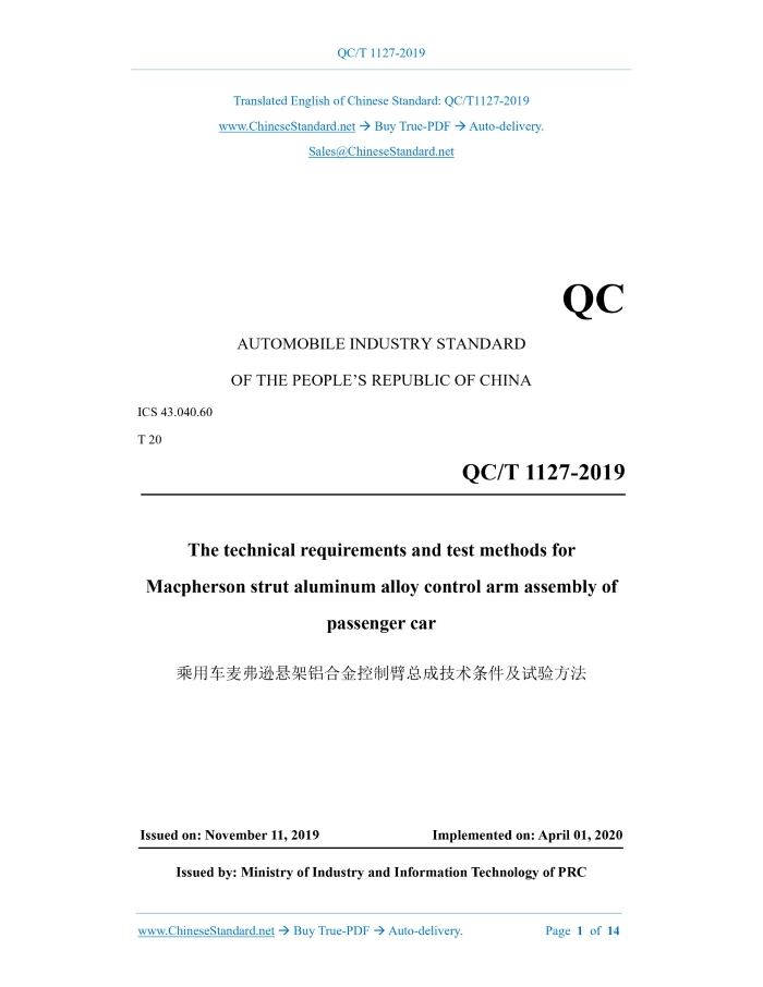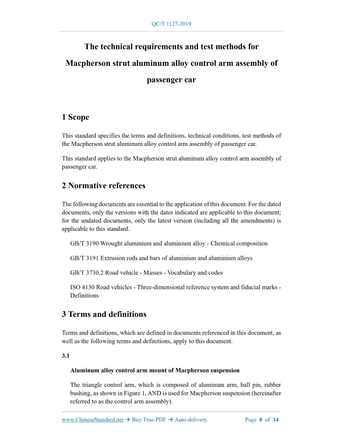 QC/T 1127-2019: Technical conditions and test methods of aluminum alloy control arm assembly for passenger car McPherson suspension Delivery: 9 seconds. True-PDF full-copy in English & invoice will be downloaded + auto-delivered via email. See step-by-step procedure Status: Valid